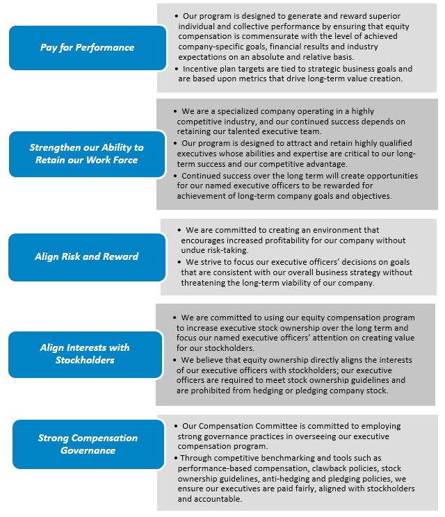 ü Compensation and Benefits. We have a market competitive compensation program designed to align the interests of our employees and our stockholders. In addition to competitive wages, we offer 401(k) and profit sharing, employer-paid health and welfare benefits, generous paid time off, and a variety of personal and family leave options.