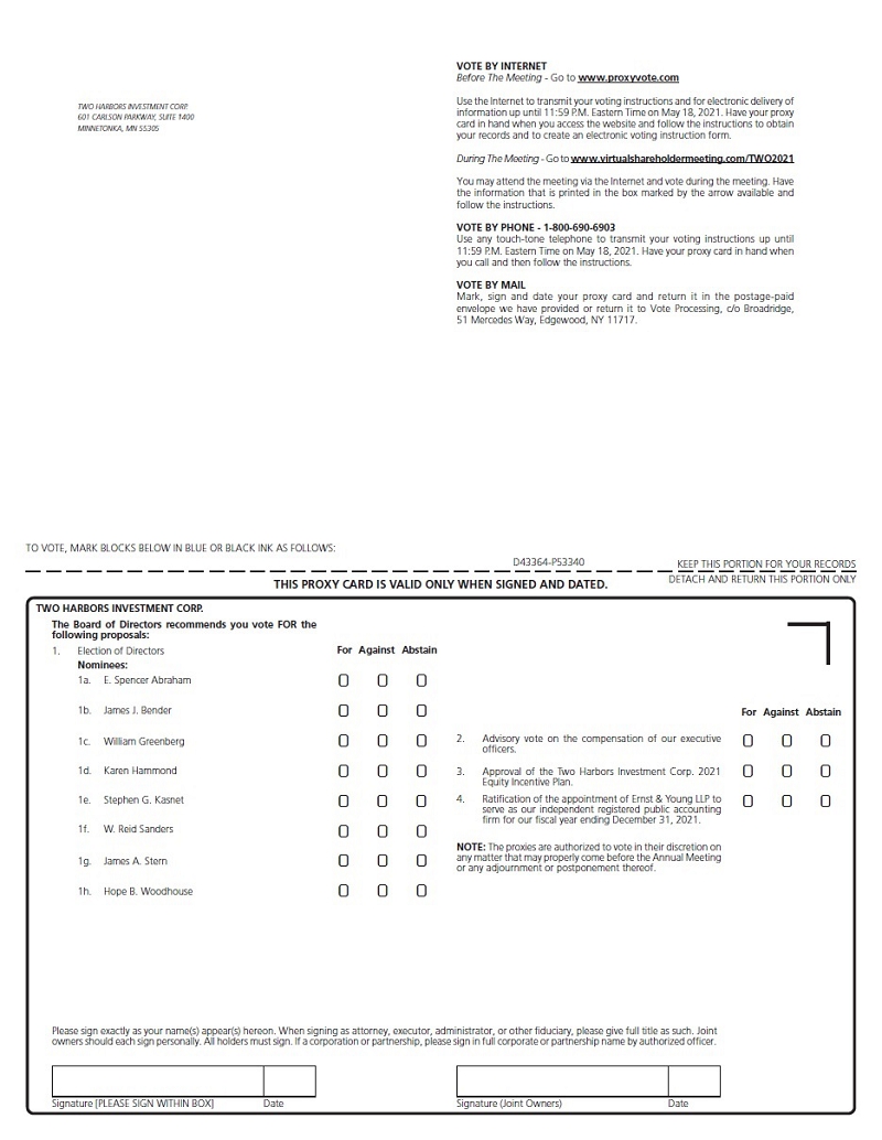 Signature [PLEASE SIGN WITHIN BOX] Date Signature (Joint Owners) Date TO VOTE, MARK BLOCKS BELOW IN BLUE OR BLACK INK AS FOLLOWS: KEEP THIS PORTION FOR YOUR RECORDS THIS PROXY CARD IS VALID ONLY WHEN SIGNED AND DATED. DETACH AND RETURN THIS PORTION ONLY D43364-P53340 TWO HARBORS INVESTMENT CORP. 601 CARLSON PARKWAY, SUITE 1400 MINNETONKA, MN 55305 For Against Abstain For Against Abstain ! ! ! ! ! ! ! ! ! ! ! ! ! ! ! ! ! ! ! ! ! ! ! ! ! ! ! ! ! ! 1b. James J. Bender 1a. E. Spencer Abraham 1d. Karen Hammond 1c. William Greenberg 1e. Stephen G. Kasnet 1g. James A. Stern 1h. Hope B. Woodhouse 1f. W. Reid Sanders 1. Election of Directors 2. Advisory vote on the compensation of our executive officers. 3. Approval of the Two Harbors Investment Corp. 2021 Equity Incentive Plan. 4. Ratification of the appointment of Ernst & Young LLP to serve as our independent registered public accounting firm for our fiscal year ending December 31, 2021. Nominees: TWO HARBORS INVESTMENT CORP. The Board of Directors recommends you vote FOR the following proposals: NOTE: The proxies are authorized to vote in their discretion on any matter that may properly come before the Annual Meeting or any adjournment or postponement thereof. Please sign exactly as your name(s) appear(s) hereon. When signing as attorney, executor, administrator, or other fiduciary, please give full title as such. Joint owners should each sign personally. All holders must sign. If a corporation or partnership, please sign in full corporate or partnership name by authorized officer. ! ! ! VOTE BY INTERNET Before The Meeting - Go to www.proxyvote.com Use the Internet to transmit your voting instructions and for electronic delivery of information up until 11:59 P.M. Eastern Time on May 18, 2021. Have your proxy card in hand when you access the website and follow the instructions to obtain your records and to create an electronic voting instruction form. During The Meeting - Go to www.virtualshareholdermeeting.com/TWO2021 You may attend the meeting via the Internet and vote during the meeting. Have the information that is printed in the box marked by the arrow available and follow the instructions. VOTE BY PHONE - 1-800-690-6903 Use any touch-tone telephone to transmit your voting instructions up until 11:59 P.M. Eastern Time on May 18, 2021. Have your proxy card in hand when you call and then follow the instructions. VOTE BY MAIL Mark, sign and date your proxy card and return it in the postage-paid envelope we have provided or return it to Vote Processing, c/o Broadridge, 51 Mercedes Way, Edgewood, NY 11717.