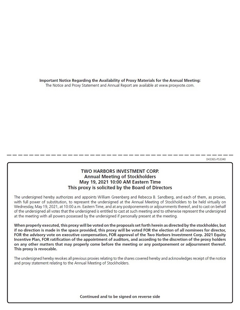 P53340Important Notice Regarding the Availability of Proxy Materials for the Annual Meeting: The Notice and Proxy Statement and Annual Report are available at www.proxyvote.com.TWO HARBORS INVESTMENT CORP.Annual Meeting of StockholdersMay 19, 2021 10:00 AM Eastern TimeThis proxy is solicited by the Board of DirectorsThe undersigned hereby authorizes and appoints William Greenberg and Rebecca B. Sandberg, and each of them, as proxies, with full power of substitution, to represent the undersigned at the Annual Meeting of Stockholders to be held virtually on Wednesday, May 19, 2021, at 10:00 a.m. Eastern Time, and at any postponements or adjournments thereof, and to cast on behalf of the undersigned all votes that the undersigned is entitled to cast at such meeting and to otherwise represent the undersigned at the meeting with all powers possessed by the undersigned if personally present at the meeting.When properly executed, this proxy will be voted on the proposals set forth herein as directed by the stockholder, but if no direction is made in the space provided, this proxy will be voted FOR the election of all nominees for director, FOR the advisory vote on executive compensation, FOR approval of the Two Harbors Investment Corp. 2021 Equity Incentive Plan, FOR ratification of the appointment of auditors, and according to the discretion of the proxy holders on any other matters that may properly come before the meeting or any postponement or adjournment thereof. This proxy is revocable.The undersigned hereby revokes all previous proxies relating to the shares covered hereby and acknowledges receipt of the notice and proxy statement relating to the Annual Meeting of Stockholders.Continued and to be signed on reverse side