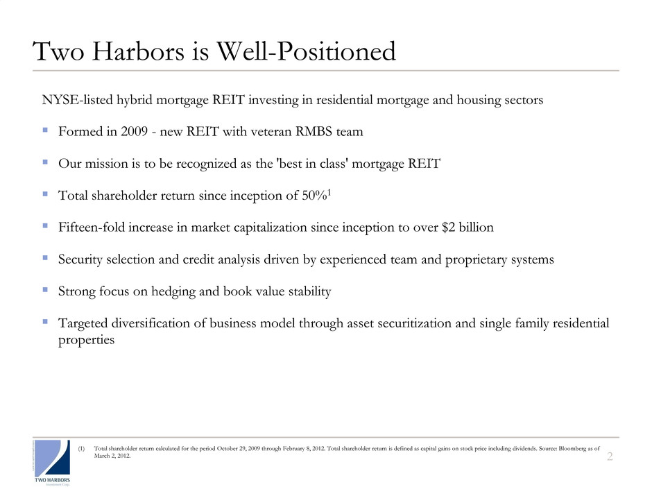 1 Safe Harbor Statement Forward-Looking Statements This presentation includes “forward-looking statements” within the meaning of the safe harbor provisions of the United States Private Securities Litigation Reform Act of 1995. Actual results may differ from expectations, estimates and projections and, consequently, readers should not rely on these forward-looking statements as predictions of future events. Words such as “expect,” “target,” “assume,” “estimate,” “project,” “budget,” “forecast,” “anticipate,” “intend,” “plan,” “may,” “will,” “could,” “should,” “believe,” “predicts,” “potential,” “continue,” and similar expressions are intended to identify such forward-looking statements. These forward-looking statements involve significant risks and uncertainties that could cause actual results to differ materially from expected results. Factors that could cause actual results to differ include, but are not limited to, higher than expected operating costs, changes in prepayment speeds of mortgages underlying our RMBS, the rates of default or decreased recovery on the mortgages underlying our non-Agency securities, failure to recover certain losses that are expected to be temporary, changes in interest rates or the availability of financing, the impact of new legislation or regulatory changes on our operations, the impact of any deficiencies in the servicing or foreclosure practices of third parties and related delays in the foreclosure process, the inability to acquire mortgage loans or securitize the mortgage loans we acquire, the inability to acquire residential real properties at attractive prices or lease such properties on a profitable basis, the impact of new or modified government mortgage refinance or principal reduction programs, and unanticipated changes in overall market and economic conditions. Readers are cautioned not to place undue reliance upon any forward-looking statements, which speak only as of the date made. Two Harbors does not undertake or accept any obligation to release publicly any updates or revisions to any forward-looking statement to reflect any change in its expectations or any change in events, conditions or circumstances on which any such statement is based. Additional information concerning these and other risk factors is contained in Two Harbors’ most recent filings with the Securities and Exchange Commission. All subsequent written and oral forward looking statements concerning Two Harbors or matters attributable to Two Harbors or any person acting on its behalf are expressly qualified in their entirety by the cautionary statements above.