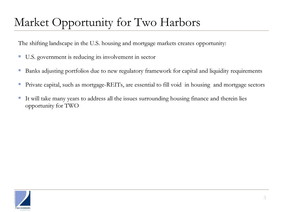 2 Two Harbors is Well-Positioned NYSE-listed hybrid mortgage REIT investing in residential mortgage and housing sectors ▪ Formed in 2009 - new REIT with veteran RMBS team ▪ Our mission is to be recognized as the 'best in class' mortgage REIT ▪ Total shareholder return since inception of 50%1 ▪ Fifteen-fold increase in market capitalization since inception to over $2 billion ▪ Security selection and credit analysis driven by experienced team and proprietary systems ▪ Strong focus on hedging and book value stability ▪ Targeted diversification of business model through asset securitization and single family residential properties (1) Total shareholder return calculated for the period October 29, 2009 through February 8, 2012. Total shareholder return is defined as capital gains on stock price including dividends. Source: Bloomberg as of March 2, 2012.