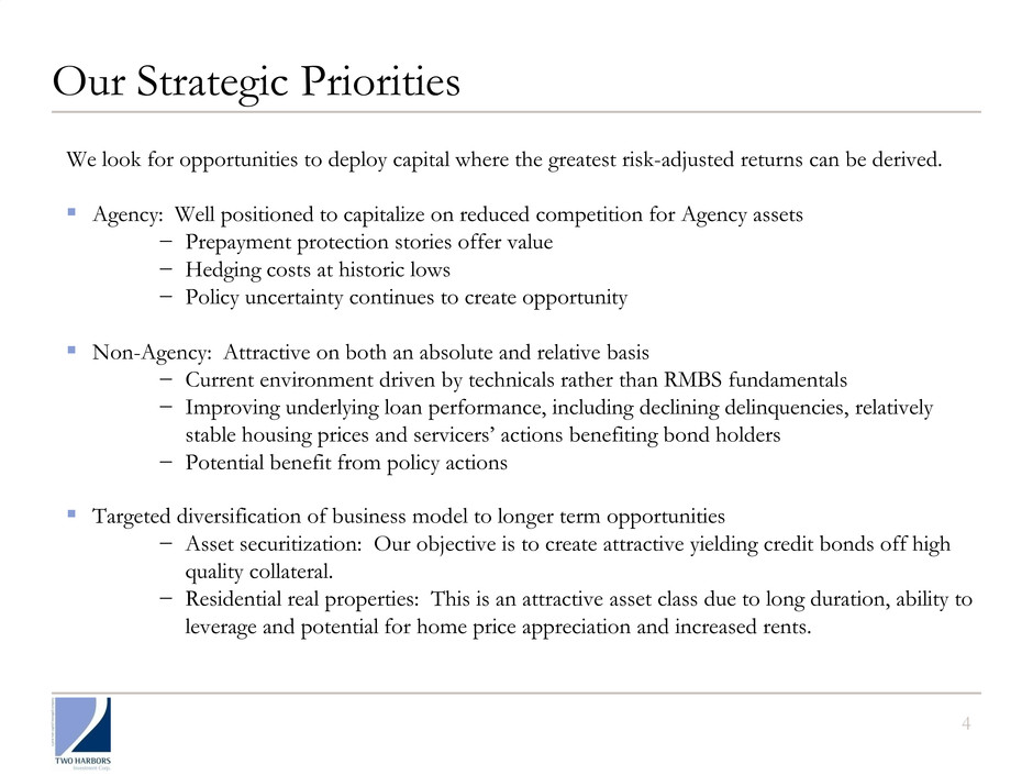 3 Market Opportunity for Two Harbors The shifting landscape in the U.S. housing and mortgage markets creates opportunity: ▪ U.S. government is reducing its involvement in sector ▪ Banks adjusting portfolios due to new regulatory framework for capital and liquidity requirements ▪ Private capital, such as mortgage-REITs, are essential to fill void in housing and mortgage sectors ▪ It will take many years to address all the issues surrounding housing finance and therein lies opportunity for TWO
