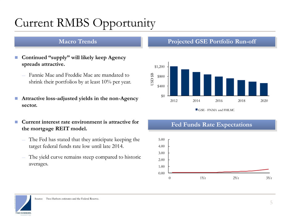 4 Our Strategic Priorities We look for opportunities to deploy capital where the greatest risk-adjusted returns can be derived. ▪ Agency: Well positioned to capitalize on reduced competition for Agency assets − Prepayment protection stories offer value − Hedging costs at historic lows − Policy uncertainty continues to create opportunity ▪ Non-Agency: Attractive on both an absolute and relative basis − Current environment driven by technicals rather than RMBS fundamentals − Improving underlying loan performance, including declining delinquencies, relatively stable housing prices and servicers’ actions benefiting bond holders − Potential benefit from policy actions ▪ Targeted diversification of business model to longer term opportunities − Asset securitization: Our objective is to create attractive yielding credit bonds off high quality collateral. − Residential real properties: This is an attractive asset class due to long duration, ability to leverage and potential for home price appreciation and increased rents.