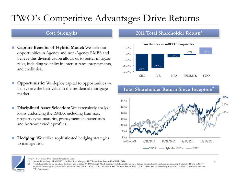 5 Current RMBS Opportunity Source: Two Harbors estimates and the Federal Reserve. $0 $400 $800 $1,200 2012 2014 2016 2018 2020 US D $B GSE - FNMA and FHLMC Projected GSE Portfolio Run-off Macro Trends Continued “supply” will likely keep Agency spreads attractive. ― Fannie Mae and Freddie Mac are mandated to shrink their portfolios by at least 10% per year. Attractive loss-adjusted yields in the non-Agency sector. Current interest rate environment is attractive for the mortgage REIT model. ― The Fed has stated that they anticipate keeping the target federal funds rate low until late 2014. ― The yield curve remains steep compared to historic averages. 0.00 1.00 2.00 3.00 4.00 5.00 0 1Yr 2Yr 3Yr Fed Funds Rate Expectations