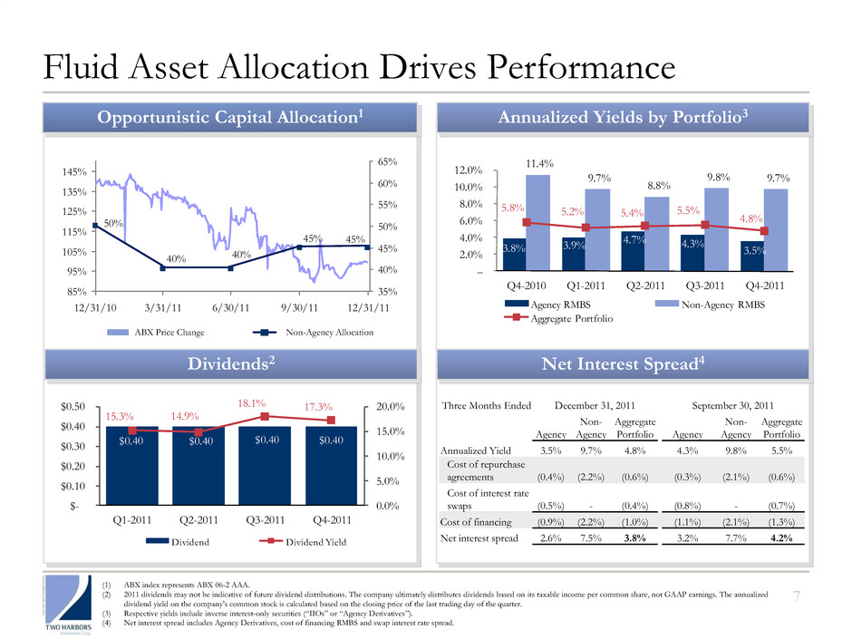 TWO’s Competitive Advantages Drive Returns Core Strengths Capture Benefits of Hybrid Model: We seek out opportunities in Agency and non-Agency RMBS and believe this diversification allows us to better mitigate risks, including volatility in interest rates, prepayments, and credit risk. Opportunistic: We deploy capital to opportunities we believe are the best value in the residential mortgage market. Disciplined Asset Selection: We extensively analyze loans underlying the RMBS, including loan size, property type, maturity, prepayment characteristics and borrower credit profiles. Hedging: We utilize sophisticated hedging strategies to manage risk. 6 Note: “TWO” means Two Harbors Investment Corp. (1) Source: Bloomberg. “PRMRITR” is the Pine River Mortgage REIT Index Total Return (PRMRITR: IND). (2) Total shareholder return calculated for the period October 29, 2009 through March 2, 2012. Total shareholder return is defined as capital gains on stock price including dividends. “Hybrid mREITs” represent the average total shareholder return of CIM, IVR and MFA. “SPXT” represents S&P 500 Total Return Index (SPXT: IND). Source: Bloomberg as of March 2, 2012, company websites and TWO’s estimates. -29% -23% -5% -2% 11% -30.0% -20.0% -10.0% 0.0% 10.0% CIM IVR MFA PRMRITR TWO Two Harbors vs. mREIT Comparables 2011 Total Shareholder Return1 Total Shareholder Return Since Inception2 50% 35% 24%