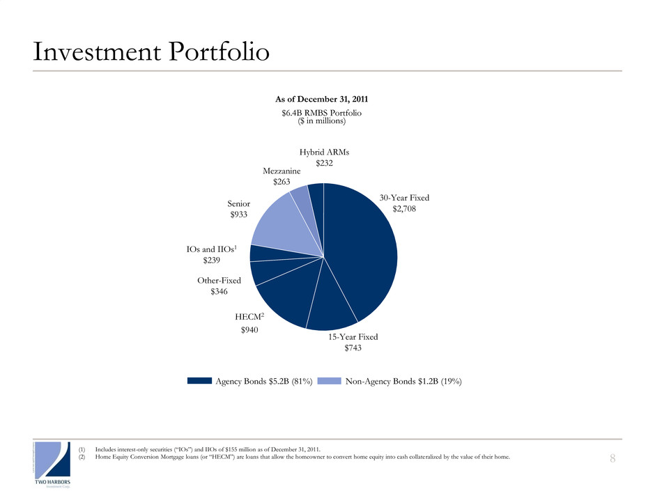 Fluid Asset Allocation Drives Performance 7 (1) ABX index represents ABX 06-2 AAA. (2) 2011 dividends may not be indicative of future dividend distributions. The company ultimately distributes dividends based on its taxable income per common share, not GAAP earnings. The annualized dividend yield on the company’s common stock is calculated based on the closing price of the last trading day of the quarter. (3) Respective yields include inverse interest-only securities (“IIOs” or “Agency Derivatives”). (4) Net interest spread includes Agency Derivatives, cost of financing RMBS and swap interest rate spread. Opportunistic Capital Allocation1 $0.40 $0.40 $0.40 $0.40 15.3% 14.9% 18.1% 17.3% 0.0% 5.0% 10.0% 15.0% 20.0% $- $0.10 $0.20 $0.30 $0.40 $0.50 Q1-2011 Q2-2011 Q3-2011 Q4-2011 Dividend Dividend Yield Dividends2 45%45% 40%40% 50% 85% 95% 105% 115% 125% 135% 145% 12/31/10 3/31/11 6/30/11 9/30/11 12/31/11 35% 40% 45% 50% 55% 60% 65% Non-Agency Allocation ABX Price Change Annualized Yields by Portfolio3 Net Interest Spread4 Three Months Ended December 31, 2011 September 30, 2011 Agency Non- Agency Aggregate Portfolio Agency Non- Agency Aggregate Portfolio Annualized Yield 3.5% 9.7% 4.8% 4.3% 9.8% 5.5% Cost of repurchase agreements (0.4%) (2.2%) (0.6%) (0.3%) (2.1%) (0.6%) Cost of interest rate swaps (0.5%) - (0.4%) (0.8%) - (0.7%) Cost of financing (0.9%) (2.2%) (1.0%) (1.1%) (2.1%) (1.3%) Net interest spread 2.6% 7.5% 3.8% 3.2% 7.7% 4.2% 3.8% 3.9% 4.7% 4.3% 3.5% 11.4% 9.7% 8.8% 9.8% 9.7% 5.8% 5.2% 5.4% 5.5% 4.8% – 2.0% 4.0% 6.0% 8.0% 10.0% 12.0% Q4-2010 Q1-2011 Q2-2011 Q3-2011 Q4-2011 Agency RMBS Non-Agency RMBS Aggregate Portfolio