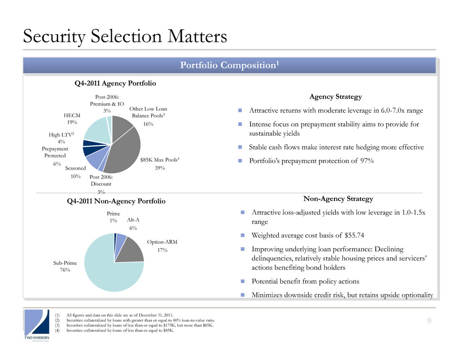 Investment Portfolio 8 (1) Includes interest-only securities (“IOs”) and IIOs of $155 million as of December 31, 2011. (2) Home Equity Conversion Mortgage loans (or “HECM”) are loans that allow the homeowner to convert home equity into cash collateralized by the value of their home. Agency Bonds $5.2B (81%) Non-Agency Bonds $1.2B (19%) As of December 31, 2011 $6.4B RMBS Portfolio 30-Year Fixed $2,708 Hybrid ARMs $232 Senior $933 Mezzanine $263 IOs and IIOs1 $239 15-Year Fixed $743 Other-Fixed $346 HECM2 $940 ($ in millions)