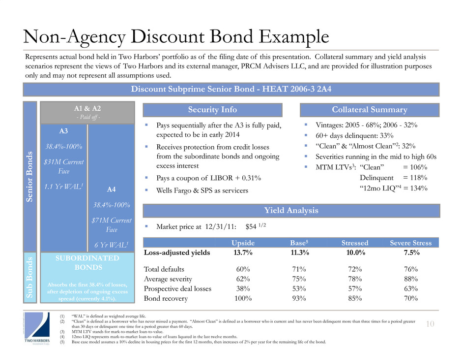Pays sequentially after the A3 is fully paid, expected to be in early 2014 Receives protection from credit losses from the subordinate bonds and ongoing excess interest Pays a coupon of LIBOR + 0.31% Wells Fargo & SPS as servicers A3 38.4%-100% $31M Current Face 1.1 Yr WAL1 Discount Subprime Senior Bond - HEAT 2006-3 2A4 SUBORDINATED BONDS Absorbs the first 38.4% of losses, after depletion of ongoing excess spread (currently 4.1%). Vintages: 2005 - 68%; 2006 - 32% 60+ days delinquent: 33% “Clean” & “Almost Clean”2: 32% Severities running in the mid to high 60s MTM LTVs3: “Clean” = 106% Delinquent = 118% “12mo LIQ”4 = 134% Market price at 12/31/11: $54 1/2 Security Info Collateral Summary Yield Analysis Upside Base5 Stressed Severe Stress Loss-adjusted yields 13.7% 11.3% 10.0% 7.5% Total defaults 60% 71% 72% 76% Average severity 62% 75% 78% 88% Prospective deal losses 38% 53% 57% 63% Bond recovery 100% 93% 85% 70% Non-Agency Discount Bond Example 10 A4 38.4%-100% $71M Current Face 6 Yr WAL1 S e n ior Bon d s A1 & A2 - Paid off - S u b Bon d s (1) “WAL” is defined as weighted average life. (2) “Clean” is defined as a borrower who has never missed a payment. “Almost Clean” is defined as a borrower who is current and has never been delinquent more than three times for a period greater than 30 days or delinquent one time for a period greater than 60 days. (3) MTM LTV stands for mark-to-market loan-to-value. (4) 12mo LIQ represents mark-to-market loan-to-value of loans liquated in the last twelve months. (5) Base case model assumes a 10% decline in housing prices for the first 12 months, then increases of 2% per year for the remaining life of the bond. Represents actual bond held in Two Harbors’ portfolio as of the filing date of this presentation. Collateral summary and yield analysis scenarios represent the views of Two Harbors and its external manager, PRCM Advisers LLC, and are provided for illustration purposes only and may not represent all assumptions used.