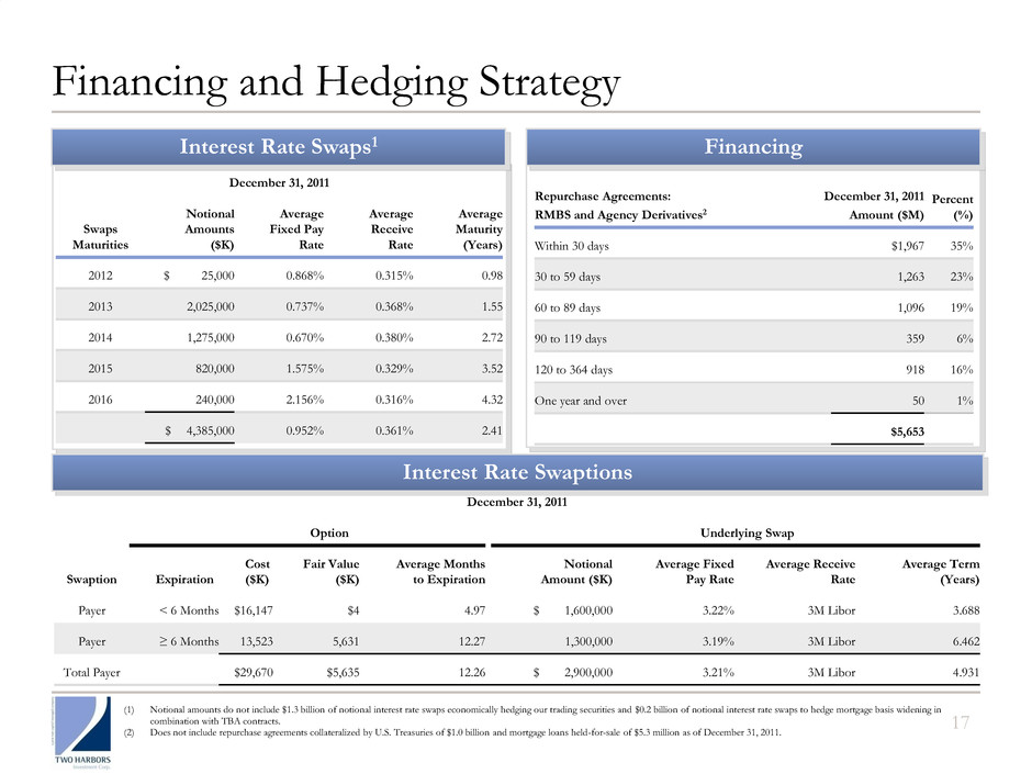 December 31, 2011 Option Underlying Swap Swaption Expiration Cost ($K) Fair Value ($K) Average Months to Expiration Notional Amount ($K) Average Fixed Pay Rate Average Receive Rate Average Term (Years) Payer < 6 Months $16,147 $4 4.97 $ 1,600,000 3.22% 3M Libor 3.688 Payer ≥ 6 Months 13,523 5,631 12.27 1,300,000 3.19% 3M Libor 6.462 Total Payer $29,670 $5,635 12.26 $ 2,900,000 3.21% 3M Libor 4.931 110 110 December 31, 2011 Swaps Maturities Notional Amounts ($K) Average Fixed Pay Rate Average Receive Rate Average Maturity (Years) 2012 $ 25,000 0.868% 0.315% 0.98 2013 2,025,000 0.737% 0.368% 1.55 2014 1,275,000 0.670% 0.380% 2.72 2015 820,000 1.575% 0.329% 3.52 2016 240,000 2.156% 0.316% 4.32 $ 4,385,000 0.952% 0.361% 2.41 17 Financing and Hedging Strategy (1) Notional amounts do not include $1.3 billion of notional interest rate swaps economically hedging our trading securities and $0.2 billion of notional interest rate swaps to hedge mortgage basis widening in combination with TBA contracts. (2) Does not include repurchase agreements collateralized by U.S. Treasuries of $1.0 billion and mortgage loans held-for-sale of $5.3 million as of December 31, 2011. Repurchase Agreements: RMBS and Agency Derivatives2 December 31, 2011 Amount ($M) Percent (%) Within 30 days $1,967 35% 30 to 59 days 1,263 23% 60 to 89 days 1,096 19% 90 to 119 days 359 6% 120 to 364 days 918 16% One year and over 50 1% $5,653 Interest Rate Swaps1 Financing Interest Rate Swaptions