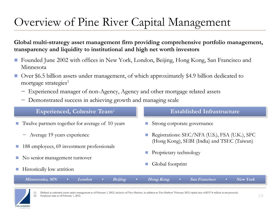 18 William Roth − Also serves as Fixed Income Portfolio Manager for Pine River − 31 years in mortgage securities market, including at Salomon Brothers and Citi; Managing Director in proprietary trading group managing MBS and ABS portfolios Investment Team Brad Farrell − Most recently served as Two Harbors’ Controller from 2009 to 2011 − Previously Vice President and Executive Director of Financial Reporting at GMAC ResCap from 2007 to 2009 and held financial roles at XL Capital Ltd from 2002 to 2007. Began his career with KPMG. Steven Kuhn − Also serves as Partner - Head of Fixed Income Trading of Pine River − Goldman Sachs Portfolio Manager from 2002 to 2007; 20 years investing in and trading mortgage backed securities and other fixed income securities for firms including Citadel and Cargill Thomas Siering − Also serves as Partner - Head of Fundamental Strategies of Pine River − Previously head of Value Investment Group at EBF & Associates; Partner since 1997 − 31 years of investing and management experience; commenced career at Cargill where he was a founding member of the Financial Markets Department Executive Officers Traders and Analysts − Trading team of nine traders and five analysts from top Street RMBS groups − Fourteen person Research Group − Three member funding team led by Repo Manager with 26 years of experience Chief Financial Officer Chief Executive Officer Co-Chief Investment Officers Substantial RMBS Team Two Harbors Team with Deep Securities Experience Note: Employee data as of February 1, 2012.