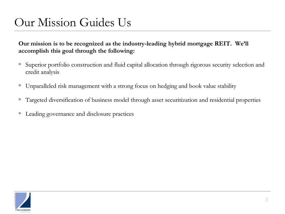 1 Safe Harbor Statement Forward-Looking Statements This presentation includes “forward-looking statements” within the meaning of the safe harbor provisions of the United States Private Securities Litigation Reform Act of 1995. Actual results may differ from expectations, estimates and projections and, consequently, readers should not rely on these forward-looking statements as predictions of future events. Words such as “expect,” “target,” “assume,” “estimate,” “project,” “budget,” “forecast,” “anticipate,” “intend,” “plan,” “may,” “will,” “could,” “should,” “believe,” “predicts,” “potential,” “continue,” and similar expressions are intended to identify such forward-looking statements. These forward-looking statements involve significant risks and uncertainties that could cause actual results to differ materially from expected results. Factors that could cause actual results to differ include, but are not limited to, higher than expected operating costs, changes in prepayment speeds of mortgages underlying our RMBS, the rates of default or decreased recovery on the mortgages underlying our non-Agency securities, failure to recover certain losses that are expected to be temporary, changes in interest rates or the availability of financing, the impact of new legislation or regulatory changes on our operations, the impact of any deficiencies in the servicing or foreclosure practices of third parties and related delays in the foreclosure process, the inability to acquire mortgage loans or securitize the mortgage loans we acquire, the inability to acquire residential real properties at attractive prices or lease such properties on a profitable basis, the impact of new or modified government mortgage refinance or principal reduction programs, and unanticipated changes in overall market and economic conditions. Readers are cautioned not to place undue reliance upon any forward-looking statements, which speak only as of the date made. Two Harbors does not undertake or accept any obligation to release publicly any updates or revisions to any forward-looking statement to reflect any change in its expectations or any change in events, conditions or circumstances on which any such statement is based. Additional information concerning these and other risk factors is contained in Two Harbors’ most recent filings with the Securities and Exchange Commission. All subsequent written and oral forward looking statements concerning Two Harbors or matters attributable to Two Harbors or any person acting on its behalf are expressly qualified in their entirety by the cautionary statements above.