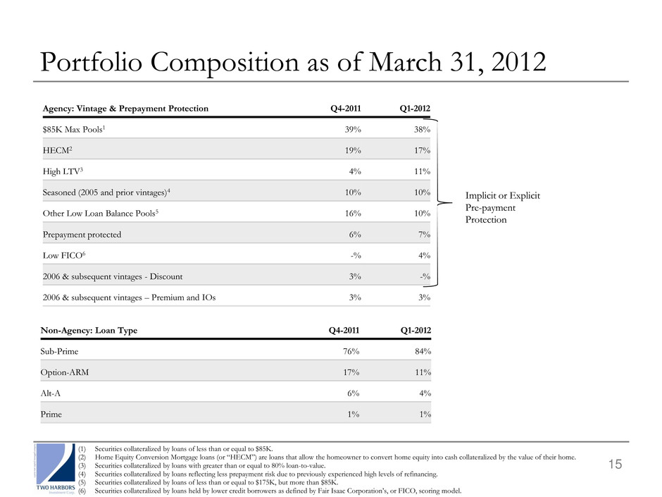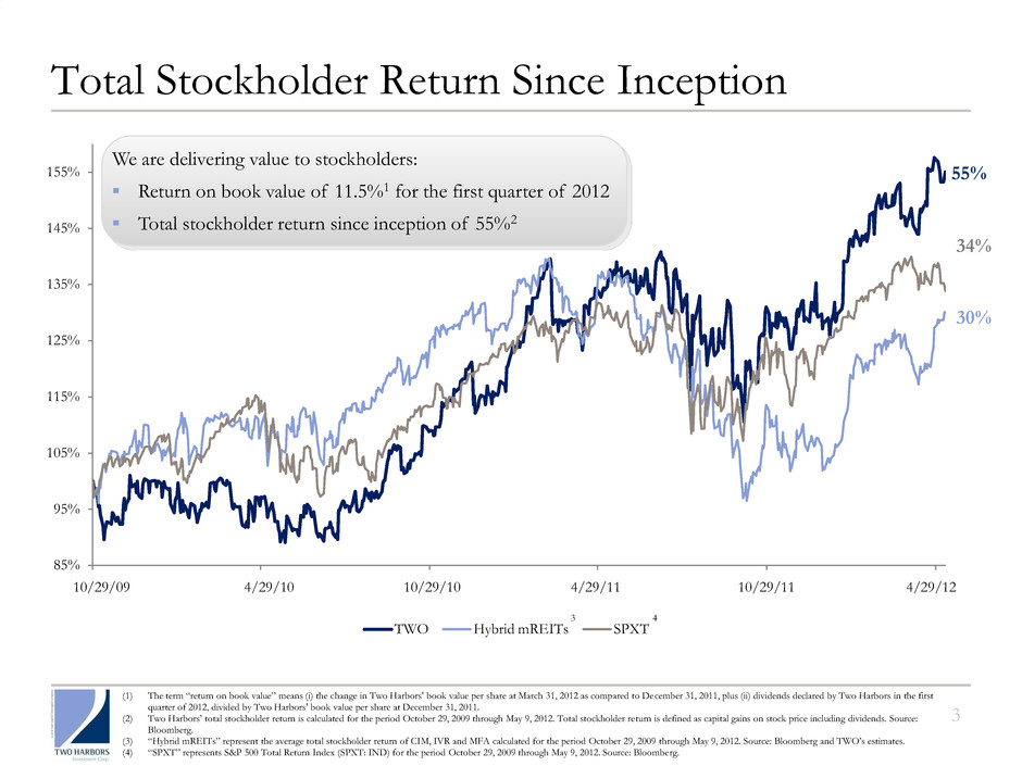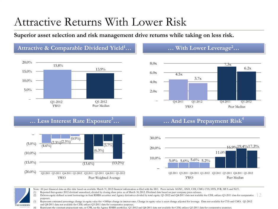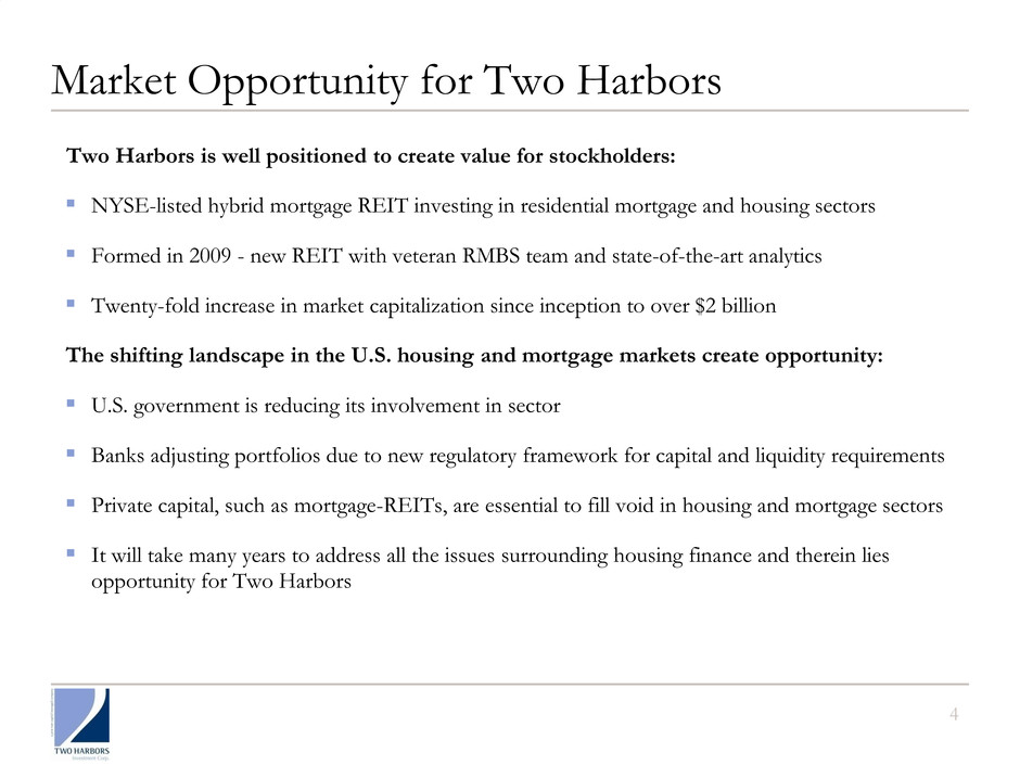 85% 95% 105% 115% 125% 135% 145% 155% 10/29/2009 4/29/2010 10/29/2010 4/29/2011 10/29/2011 4/29/2012 TWO Hybrid mREITs SPXT 10/29/09 4/29/10 10/29/10 4/29/11 10/29/11 4/29/12 Total Stockholder Return Since Inception 3 55% 30% 34% (1) The term “return on book value” means (i) the change in Two Harbors' book value per share at March 31, 2012 as compared to December 31, 2011, plus (ii) dividends declared by Two Harbors in the first quarter of 2012, divided by Two Harbors' book value per share at December 31, 2011. (2) Two Harbors’ total stockholder return is calculated for the period October 29, 2009 through May 9, 2012. Total stockholder return is defined as capital gains on stock price including dividends. Source: Bloomberg. (3) “Hybrid mREITs” represent the average total stockholder return of CIM, IVR and MFA calculated for the period October 29, 2009 through May 9, 2012. Source: Bloomberg and TWO’s estimates. (4) “SPXT” represents S&P 500 Total Return Index (SPXT: IND) for the period October 29, 2009 through May 9, 2012. Source: Bloomberg. We are delivering value to stockholders: ▪ Return on book value of 11.5%1 for the first quarter of 2012 ▪ Total stockholder return since inception of 55%2 3 4