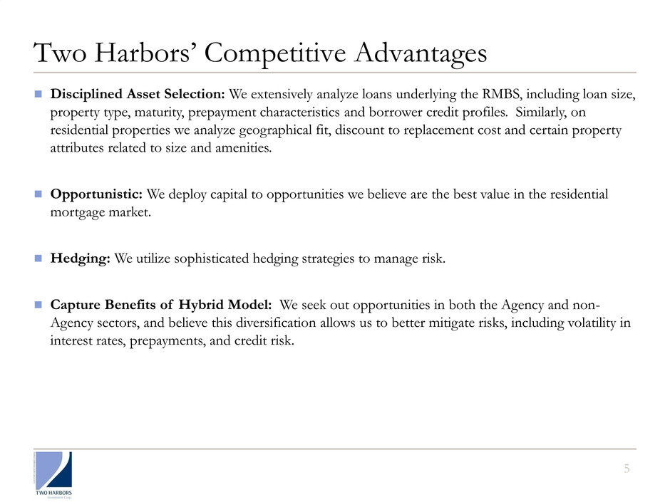 4 Market Opportunity for Two Harbors Two Harbors is well positioned to create value for stockholders: ▪ NYSE-listed hybrid mortgage REIT investing in residential mortgage and housing sectors ▪ Formed in 2009 - new REIT with veteran RMBS team and state-of-the-art analytics ▪ Twenty-fold increase in market capitalization since inception to over $2 billion The shifting landscape in the U.S. housing and mortgage markets create opportunity: ▪ U.S. government is reducing its involvement in sector ▪ Banks adjusting portfolios due to new regulatory framework for capital and liquidity requirements ▪ Private capital, such as mortgage-REITs, are essential to fill void in housing and mortgage sectors ▪ It will take many years to address all the issues surrounding housing finance and therein lies opportunity for Two Harbors
