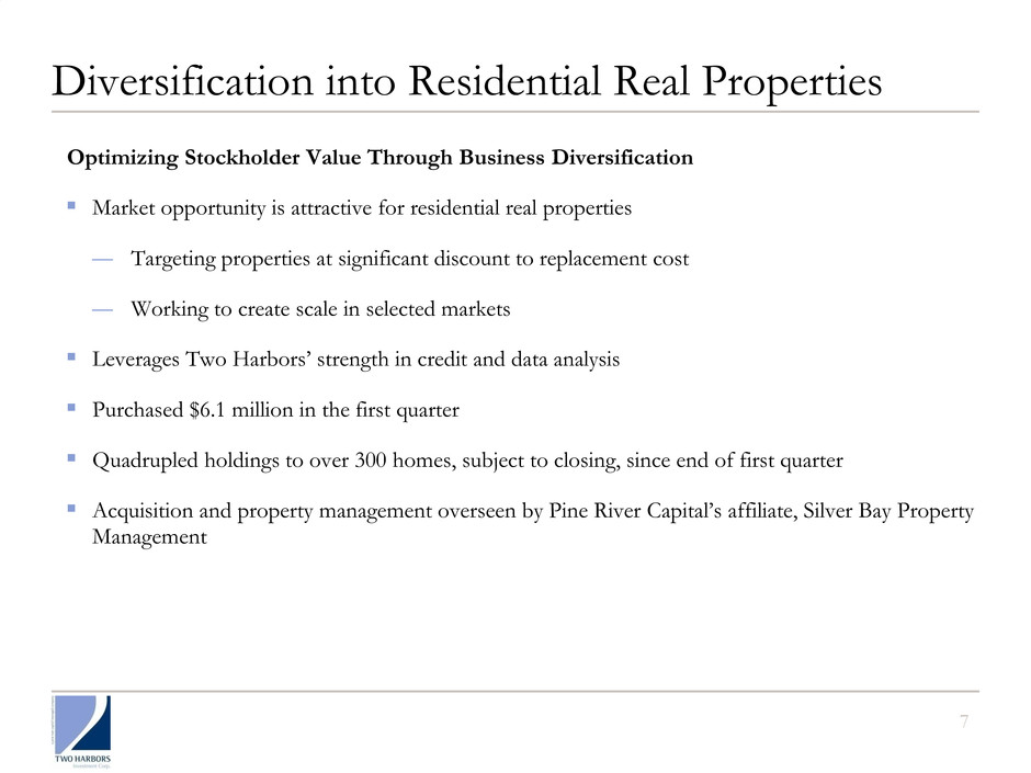 6 Our Strategic Focus Areas We look for opportunities to deploy capital where the greatest risk-adjusted returns can be derived. ▪ Agency: Well positioned to capitalize on reduced competition for Agency assets − Prepayment protection stories offer value − Hedging costs at historic lows − Policy uncertainty continues to create opportunity ▪ Non-Agency: Attractive on both an absolute and relative basis − Technicals have weighed on this sector, but fundamentals have improved − Improving underlying loan performance, including declining delinquencies, relatively stable housing prices and servicers’ actions benefiting bond holders − Potential benefit from policy actions ▪ Targeted diversification of business model to longer term opportunities − Residential real properties: This is an attractive asset class due to long duration, ability to leverage and potential for home price appreciation and increased rents. − Asset securitization: Our objective is to create attractive yielding credit bonds off high quality collateral.
