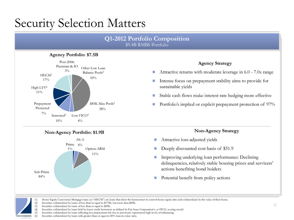Fluid Asset Allocation Drives Performance 8 (1) The first quarter 2012 dividend may not be indicative of future dividend distributions. The company ultimately distributes dividends based on its taxable income per common share, not GAAP earnings. The annualized dividend yield on the company’s common stock is calculated based on the closing price of the last trading day of the quarter. (2) Respective yields include inverse interest-only securities (“Agency Derivatives”). (3) Net interest spread includes Agency Derivatives, cost of financing RMBS and swap interest rate spread. Targeted Capital Allocation Dividends1 Annualized Yields by Portfolio2 Net Interest Spread3 50% 60% 60% 55% 55% 52% 50% 40% 40% 45% 45% 48% 30% 40% 50% 60% Agency Allocation Non-Agency Allocation Q4-2010 Q1-2011 Q2-2011 Q3-2011 Q4-2011 Q1-2012 $0.40 $0.40 $0.40 $0.40 $0.40 $0.40 16.3 15.3% 14.9% 18.1% 17.3% 15.8% 0.0% 5.0% 10.0% 15.0% 20.0% $- $0.10 $0.20 $0.30 $0. 0 $0.50 Q4-2010 Q1-2011 Q2-2011 Q3-2011 Q4-2011 Q1-2012 Dividend per Share Dividend Yield (%) 3.8% 3.9% 4.7% 4.3% 3.5% 3.5% 11.4% 9.7% 8.8% 9.8% 9.7% 9.7% 5.8% 5.2% 5.4% 5.5% 4.8% 4.9% – 2.0% 4.0% 6.0% 8.0% 10.0% 12.0% Q4-2010 Q1-2011 Q2-2011 Q3-2011 Q4-2011 Q1-2012 Agency RMBS Non-Agency RMBS Aggregate Portfolio Three Months Ended December 31, 2011 March 31, 2012 Agency Non- Agency Aggregate Portfolio Agency Non- Agency Aggregate Portfolio Annualized Yield 3.5% 9.7% 4.8% 3.5% 9.7% 4.9% Cost of repurchase agreements (0.4%) (2.2%) (0.6%) (0.4%) (2.3%) (0.7%) Cost of interest rate swaps & swaptions (0.5%) - (0.4%) (0.3%) - (0.3%) Cost of financing (0.9%) (2.2%) (1.0%) (0.7%) (2.3%) (1.0%) Net interest spread 2.6% 7.5% 3.8% 2.8% 7.4% 3.9%