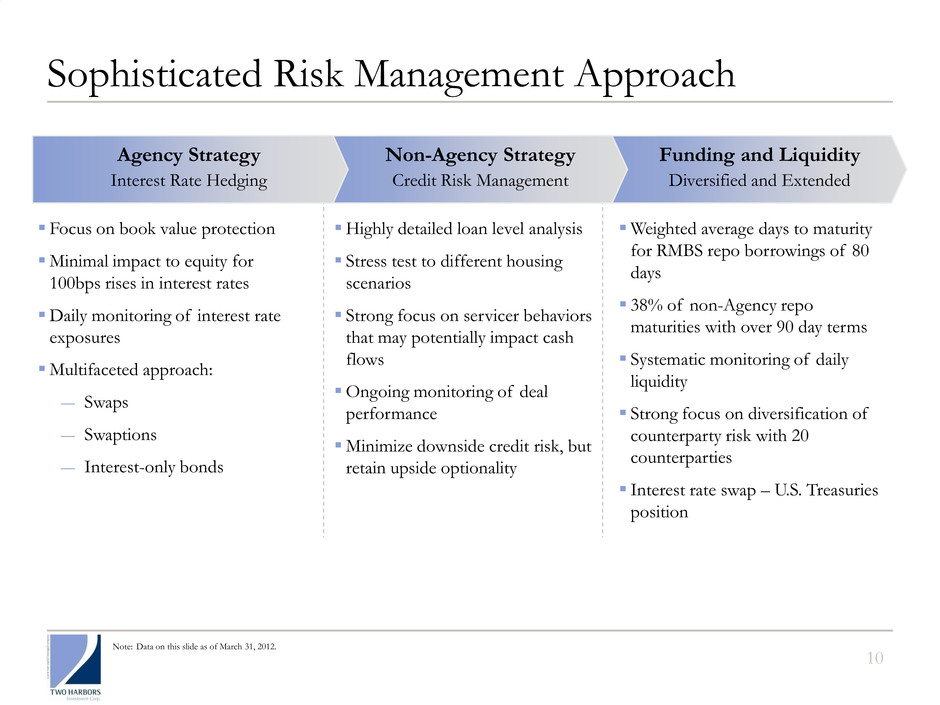 9 Security Selection Matters (1) Home Equity Conversion Mortgage loans (or “HECM”) are loans that allow the homeowner to convert home equity into cash collateralized by the value of their home. (2) Securities collateralized by loans of less than or equal to $175K, but more than $85K. (3) Securities collateralized by loans of less than or equal to $85K. (4) Securities collateralized by loans held by lower credit borrowers as defined by Fair Isaac Corporation’s, or FICO, scoring model. (5) Securities collateralized by loans reflecting less prepayment risk due to previously experienced high levels of refinancing. (6) Securities collateralized by loans with greater than or equal to 80% loan-to-value ratio. Agency Strategy Attractive returns with moderate leverage in 6.0 - 7.0x range Intense focus on prepayment stability aims to provide for sustainable yields Stable cash flows make interest rate hedging more effective Portfolio’s implied or explicit prepayment protection of 97% Non-Agency Strategy Attractive loss-adjusted yields Deeply discounted cost basis of $51.9 Improving underlying loan performance: Declining delinquencies, relatively stable housing prices and servicers’ actions benefiting bond holders Potential benefit from policy actions Q1-2012 Portfolio Composition $9.4B RMBS Portfolio Agency Portfolio: $7.5B $85K Max Pools3 38% Prepayment Protected 7% Post-2006: Premium & IO 3% High LTV6 11% Seasoned5 10% Sub-Prime 84% Option-ARM 11% Prime 1% Alt-A 4% HECM1 17% Other Low Loan Balance Pools2 10% Non-Agency Portfolio: $1.9B Low FICO4 4%