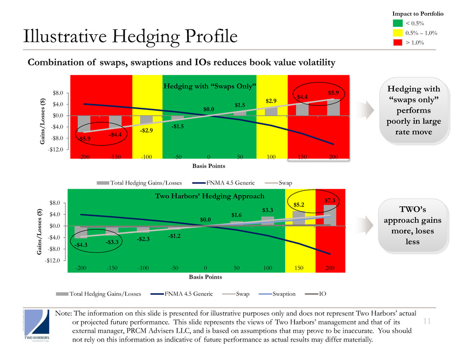 10 Sophisticated Risk Management Approach Funding and Liquidity Diversified and Extended Non-Agency Strategy Credit Risk Management Agency Strategy Interest Rate Hedging Focus on book value protection Minimal impact to equity for 100bps rises in interest rates Daily monitoring of interest rate exposures Multifaceted approach: ― Swaps ― Swaptions ― Interest-only bonds Highly detailed loan level analysis Stress test to different housing scenarios Strong focus on servicer behaviors that may potentially impact cash flows Ongoing monitoring of deal performance Minimize downside credit risk, but retain upside optionality Weighted average days to maturity for RMBS repo borrowings of 80 days 38% of non-Agency repo maturities with over 90 day terms Systematic monitoring of daily liquidity Strong focus on diversification of counterparty risk with 20 counterparties Interest rate swap – U.S. Treasuries position Note: Data on this slide as of March 31, 2012.