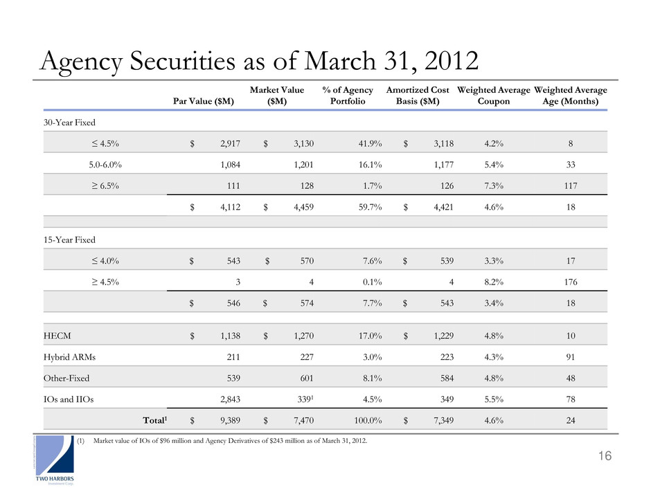 15 Portfolio Composition as of March 31, 2012 Agency: Vintage & Prepayment Protection Q4-2011 Q1-2012 $85K Max Pools1 39% 38% HECM2 19% 17% High LTV3 4% 11% Seasoned (2005 and prior vintages)4 10% 10% Other Low Loan Balance Pools5 16% 10% Prepayment protected 6% 7% Low FICO6 -% 4% 2006 & subsequent vintages - Discount 3% -% 2006 & subsequent vintages – Premium and IOs 3% 3% Implicit or Explicit Pre-payment Protection Non-Agency: Loan Type Q4-2011 Q1-2012 Sub-Prime 76% 84% Option-ARM 17% 11% Alt-A 6% 4% Prime 1% 1% (1) Securities collateralized by loans of less than or equal to $85K. (2) Home Equity Conversion Mortgage loans (or “HECM”) are loans that allow the homeowner to convert home equity into cash collateralized by the value of their home. (3) Securities collateralized by loans with greater than or equal to 80% loan-to-value. (4) Securities collateralized by loans reflecting less prepayment risk due to previously experienced high levels of refinancing. (5) Securities collateralized by loans of less than or equal to $175K, but more than $85K. (6) Securities collateralized by loans held by lower credit borrowers as defined by Fair Isaac Corporation’s, or FICO, scoring model.