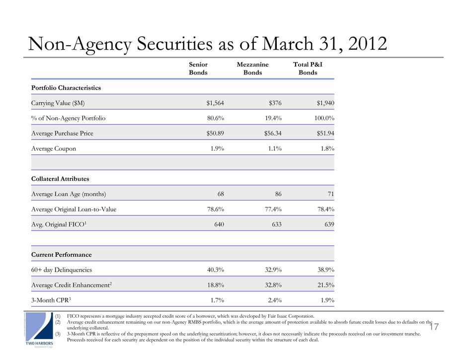 16 Agency Securities as of March 31, 2012 Par Value ($M) Market Value ($M) % of Agency Portfolio Amortized Cost Basis ($M) Weighted Average Coupon Weighted Average Age (Months) 30-Year Fixed ≤ 4.5% $ 2,917 $ 3,130 41.9% $ 3,118 4.2% 8 5.0-6.0% 1,084 1,201 16.1% 1,177 5.4% 33 ≥ 6.5% 111 128 1.7% 126 7.3% 117 $ 4,112 $ 4,459 59.7% $ 4,421 4.6% 18 15-Year Fixed ≤ 4.0% $ 543 $ 570 7.6% $ 539 3.3% 17 ≥ 4.5% 3 4 0.1% 4 8.2% 176 $ 546 $ 574 7.7% $ 543 3.4% 18 HECM $ 1,138 $ 1,270 17.0% $ 1,229 4.8% 10 Hybrid ARMs 211 227 3.0% 223 4.3% 91 Other-Fixed 539 601 8.1% 584 4.8% 48 IOs and IIOs 2,843 3391 4.5% 349 5.5% 78 Total1 $ 9,389 $ 7,470 100.0% $ 7,349 4.6% 24 (1) Market value of IOs of $96 million and Agency Derivatives of $243 million as of March 31, 2012.