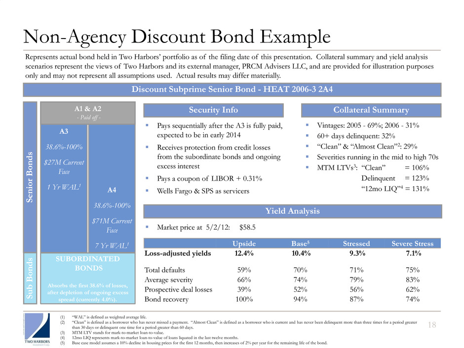 Pays sequentially after the A3 is fully paid, expected to be in early 2014 Receives protection from credit losses from the subordinate bonds and ongoing excess interest Pays a coupon of LIBOR + 0.31% Wells Fargo & SPS as servicers A3 38.6%-100% $27M Current Face 1 Yr WAL1 Discount Subprime Senior Bond - HEAT 2006-3 2A4 SUBORDINATED BONDS Absorbs the first 38.6% of losses, after depletion of ongoing excess spread (currently 4.0%). Vintages: 2005 - 69%; 2006 - 31% 60+ days delinquent: 32% “Clean” & “Almost Clean”2: 29% Severities running in the mid to high 70s MTM LTVs3: “Clean” = 106% Delinquent = 123% “12mo LIQ”4 = 131% Market price at 5/2/12: $58.5 Security Info Collateral Summary Yield Analysis Upside Base5 Stressed Severe Stress Loss-adjusted yields 12.4% 10.4% 9.3% 7.1% Total defaults 59% 70% 71% 75% Average severity 66% 74% 79% 83% Prospective deal losses 39% 52% 56% 62% Bond recovery 100% 94% 87% 74% Non-Agency Discount Bond Example 18 A4 38.6%-100% $71M Current Face 7 Yr WAL1 S e n ior Bon d s A1 & A2 - Paid off - S u b Bon d s (1) “WAL” is defined as weighted average life. (2) “Clean” is defined as a borrower who has never missed a payment. “Almost Clean” is defined as a borrower who is current and has never been delinquent more than three times for a period greater than 30 days or delinquent one time for a period greater than 60 days. (3) MTM LTV stands for mark-to-market loan-to-value. (4) 12mo LIQ represents mark-to-market loan-to-value of loans liquated in the last twelve months. (5) Base case model assumes a 10% decline in housing prices for the first 12 months, then increases of 2% per year for the remaining life of the bond. Represents actual bond held in Two Harbors’ portfolio as of the filing date of this presentation. Collateral summary and yield analysis scenarios represent the views of Two Harbors and its external manager, PRCM Advisers LLC, and are provided for illustration purposes only and may not represent all assumptions used. Actual results may differ materially.