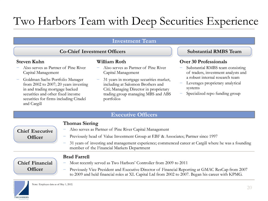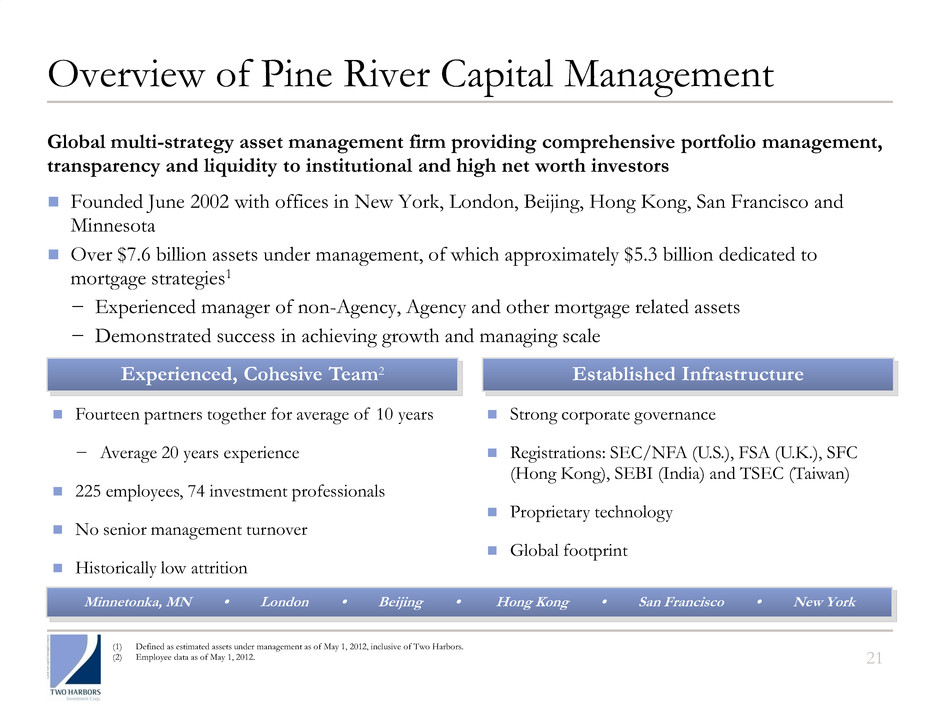 20 William Roth − Also serves as Partner of Pine River Capital Management − 31 years in mortgage securities market, including at Salomon Brothers and Citi; Managing Director in proprietary trading group managing MBS and ABS portfolios Investment Team Brad Farrell − Most recently served as Two Harbors’ Controller from 2009 to 2011 − Previously Vice President and Executive Director of Financial Reporting at GMAC ResCap from 2007 to 2009 and held financial roles at XL Capital Ltd from 2002 to 2007. Began his career with KPMG. Steven Kuhn − Also serves as Partner of Pine River Capital Management − Goldman Sachs Portfolio Manager from 2002 to 2007; 20 years investing in and trading mortgage backed securities and other fixed income securities for firms including Citadel and Cargill Thomas Siering − Also serves as Partner of Pine River Capital Management − Previously head of Value Investment Group at EBF & Associates; Partner since 1997 − 31 years of investing and management experience; commenced career at Cargill where he was a founding member of the Financial Markets Department Executive Officers Over 30 Professionals − Substantial RMBS team consisting of traders, investment analysts and a robust internal research team − Leverages proprietary analytical systems − Specialized repo funding group Chief Financial Officer Chief Executive Officer Co-Chief Investment Officers Substantial RMBS Team Two Harbors Team with Deep Securities Experience Note: Employee data as of May 1, 2012.