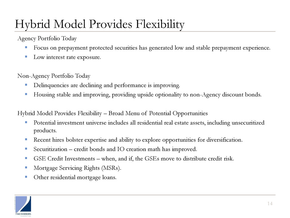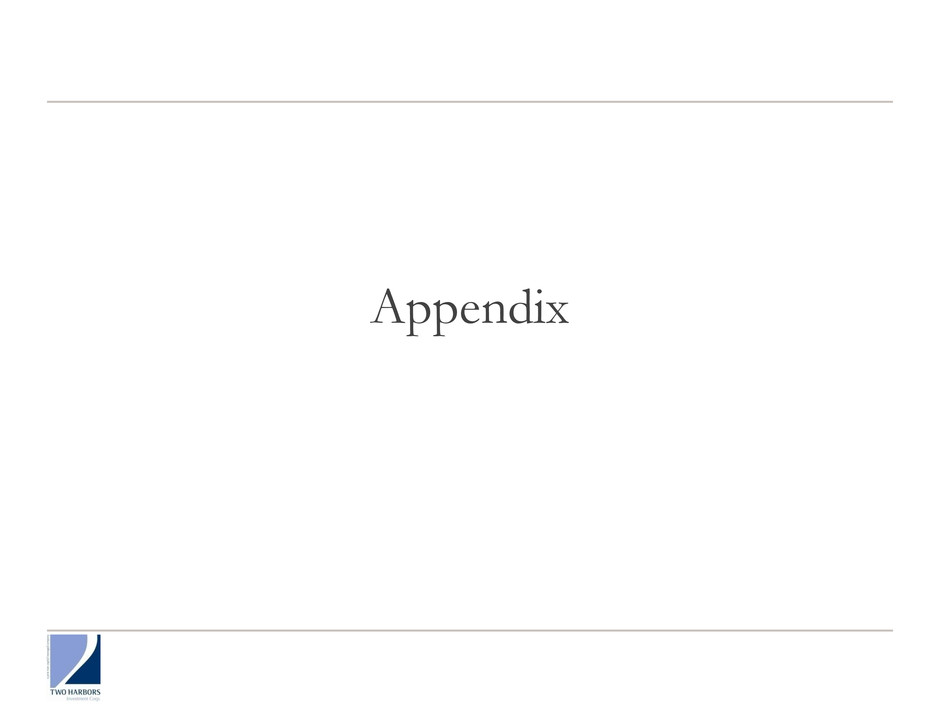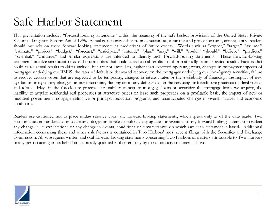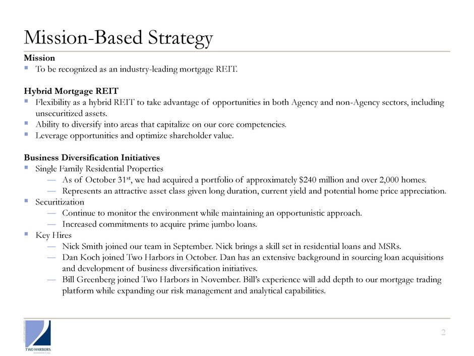 1 Safe Harbor Statement This presentation includes “forward-looking statements” within the meaning of the safe harbor provisions of the United States Private Securities Litigation Reform Act of 1995. Actual results may differ from expectations, estimates and projections and, consequently, readers should not rely on these forward-looking statements as predictions of future events. Words such as “expect,” “target,” “assume,” “estimate,” “project,” “budget,” “forecast,” “anticipate,” “intend,” “plan,” “may,” “will,” “could,” “should,” “believe,” “predicts,” “potential,” “continue,” and similar expressions are intended to identify such forward-looking statements. These forward-looking statements involve significant risks and uncertainties that could cause actual results to differ materially from expected results. Factors that could cause actual results to differ include, but are not limited to, higher than expected operating costs, changes in prepayment speeds of mortgages underlying our RMBS, the rates of default or decreased recovery on the mortgages underlying our non-Agency securities, failure to recover certain losses that are expected to be temporary, changes in interest rates or the availability of financing, the impact of new legislation or regulatory changes on our operations, the impact of any deficiencies in the servicing or foreclosure practices of third parties and related delays in the foreclosure process, the inability to acquire mortgage loans or securitize the mortgage loans we acquire, the inability to acquire residential real properties at attractive prices or lease such properties on a profitable basis, the impact of new or modified government mortgage refinance or principal reduction programs, and unanticipated changes in overall market and economic conditions. Readers are cautioned not to place undue reliance upon any forward-looking statements, which speak only as of the date made. Two Harbors does not undertake or accept any obligation to release publicly any updates or revisions to any forward-looking statement to reflect any change in its expectations or any change in events, conditions or circumstances on which any such statement is based. Additional information concerning these and other risk factors is contained in Two Harbors’ most recent filings with the Securities and Exchange Commission. All subsequent written and oral forward looking statements concerning Two Harbors or matters attributable to Two Harbors or any person acting on its behalf are expressly qualified in their entirety by the cautionary statements above.
