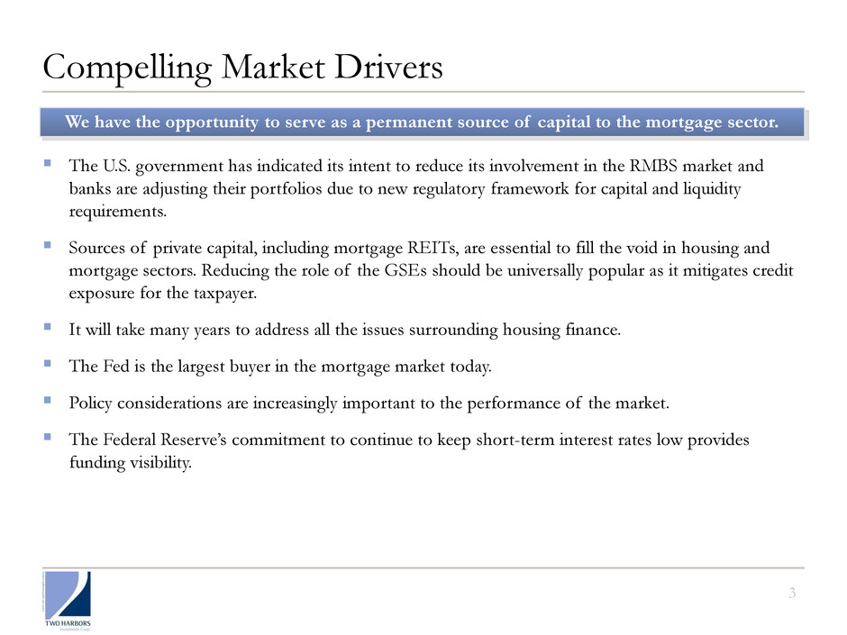 Mission To be recognized as an industry-leading mortgage REIT. Hybrid Mortgage REIT Flexibility as a hybrid REIT to take advantage of opportunities in both Agency and non-Agency sectors, including unsecuritized assets. Ability to diversify into areas that capitalize on our core competencies. Leverage opportunities and optimize shareholder value. Business Diversification Initiatives Single Family Residential Properties ― As of October 31st, we had acquired a portfolio of approximately $240 million and over 2,000 homes. ― Represents an attractive asset class given long duration, current yield and potential home price appreciation. Securitization ― Continue to monitor the environment while maintaining an opportunistic approach. ― Increased commitments to acquire prime jumbo loans. Key Hires ― Nick Smith joined our team in September. Nick brings a skill set in residential loans and MSRs. ― Dan Koch joined Two Harbors in October. Dan has an extensive background in sourcing loan acquisitions and development of business diversification initiatives. ― Bill Greenberg joined Two Harbors in November. Bill’s experience will add depth to our mortgage trading platform while expanding our risk management and analytical capabilities. Mission-Based Strategy 2