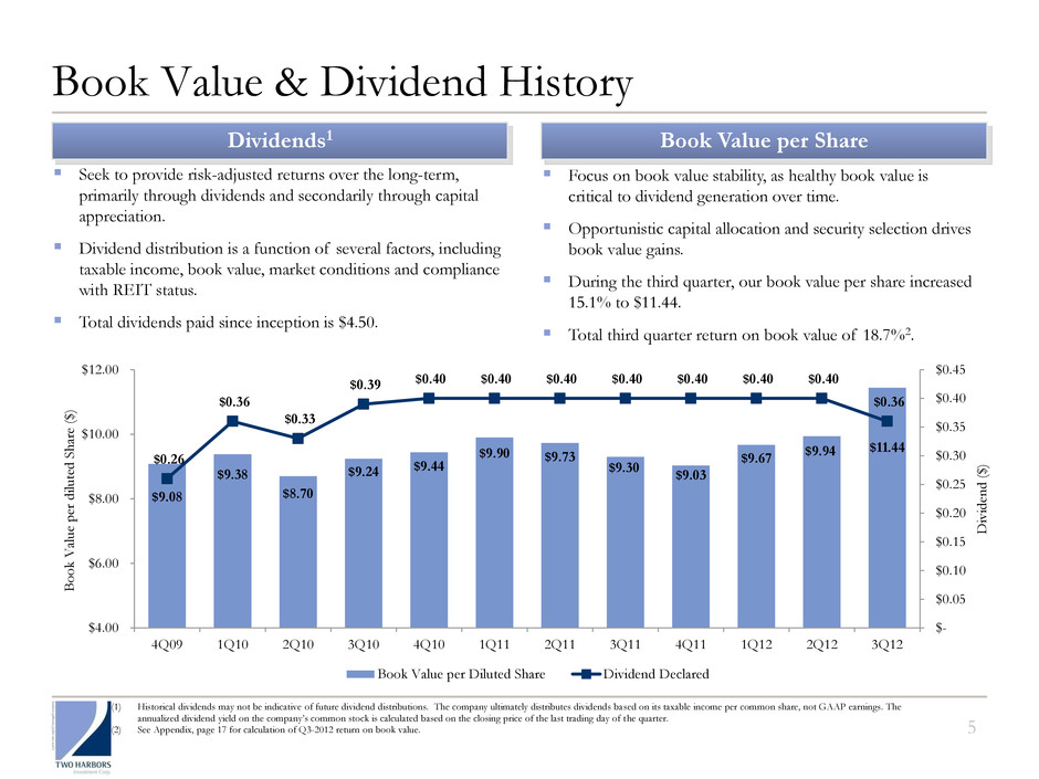 Building a Strong Franchise 4 2009 Inception October 29, 2009 2012 Market capitalization surpasses $3 billion 2010 Market capitalization reaches $400 million 2011 Market capitalization surpasses $1 billion Initial investments aggregating $488 million Listing transferred to NYSE Announced share repurchase program of up to 10 million shares Proposed contribution of single-family rental properties to Silver Bay Realty Trust Total RMBS portfolio exceeds $15 billion Lowered expense ratio Increased liquidity in TWO shares $0.1 $0.1 $0.2 $0.2 $0.4 $0.7 $1.0 $1.2 $1.3 $2.2 $2.2 $3.3 $0.1 $0.6 $1.1 $1.6 $2.1 $2.6 $3.1 4Q09 1Q10 2Q10 3Q10 4Q10 1Q11 2Q11 3Q11 4Q11 1Q12 2Q12 3Q12 M ar k e t C ap (in bi l) Two Market Cap Since Inception1 (1) Source: Bloomberg.