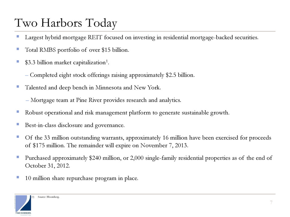 -15% 5% 25% 45% 65% 85% Oct-09 Apr-10 Oct-10 Apr-11 Oct-11 Apr-12 Oct-12 Delivering Total Return 6 (1) Two Harbors’ total stockholder return is calculated for the period October 29, 2009 through November 9, 2012. Total stockholder return is defined as capital gains on stock price including dividends. Source: Bloomberg. (2) Two Harbors’ total stockholder return is calculated for the period December 31, 2011 through November 9, 2012. Source: Bloomberg. (3) “Hybrid mREITs” represent the average total stockholder return of CIM, IVR and MFA calculated for the period October 29, 2009 through November 9, 2012. Source: Bloomberg and TWO’s estimates. (4) Peers group includes: IVR, MFA, CIM, NLY, HTS, CMO, ANH, AGNC and CYS (5) “SPXT” represents S&P 500 Total Return Index (SPXT: IND) for the period October 29, 2009 through November 9, 2012. Source: Bloomberg. 77% 43% 46% 38% TWO Hybrid mREITs3 Peers4 SPXT5 Total stockholder return since inception of 77%1. Total YTD stockholder return of 32%2.