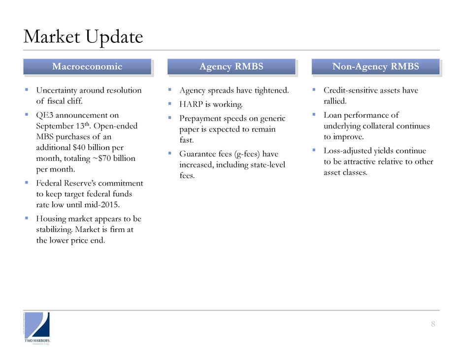 Two Harbors Today 7 (1) Source: Bloomberg. Largest hybrid mortgage REIT focused on investing in residential mortgage-backed securities. Total RMBS portfolio of over $15 billion. $3.3 billion market capitalization1. – Completed eight stock offerings raising approximately $2.5 billion. Talented and deep bench in Minnesota and New York. – Mortgage team at Pine River provides research and analytics. Robust operational and risk management platform to generate sustainable growth. Best-in-class disclosure and governance. Of the 33 million outstanding warrants, approximately 16 million have been exercised for proceeds of $175 million. The remainder will expire on November 7, 2013. Purchased approximately $240 million, or 2,000 single-family residential properties as of the end of October 31, 2012. 10 million share repurchase program in place.
