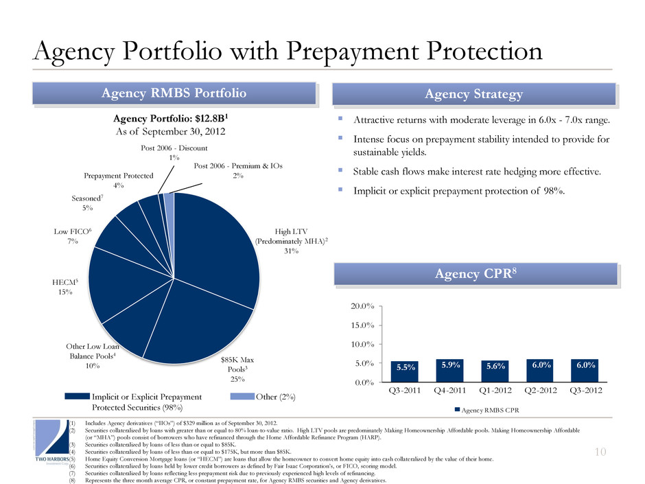 Fluid Asset Allocation Drives Performance 9 Investment Portfolio Net Interest Spread Capital Allocation 0% 10% 20% 30% 40% 50% 60% Q4-2010 Q1-2011 Q2-2011 Q3-2011 Q4-2011 Q1-2012 Q2-2012 Q3-2012 50% 60% 60% 55% 55% 52% 52% 57% 50% 40% 40% 45% 45% 48% 44% 36% 4% 7% Agency Non-Agency Residential Real Properties 30-Year Fixed $8,972 15-Year Fixed $537 HECM2 $1,891 Other-Fixed $698 IOs and IIOs1 $499 Hybrid ARMs $201 Mezzanine $507 Senior $1,990 Non-Agency Other $4 As of September 30, 2012 $15.3B RMBS Portfolio $ Millions Agency Bonds $12.8B (84%) Non-Agency Bonds $2.5B (16%) (1) Includes Agency Derivatives (“IIOs”) of $329 million as of September 30, 2012. (2) Home Equity Conversion Mortgage loans (or “HECM”) are loans that allow the homeowner to convert home equity into cash collateralized by the value of their home. (3) Agency yield includes impact of Agency Derivatives. Interest income on Agency Derivatives was $7.7 million for the third quarter of 2012, contributing an additional 0.2% to Agency yield and to the aggregate annualized yield for the third quarter of 2012. Three Months Ended September 30, 2012 Agency Non-Agency Aggregate Portfolio Annualized Yield3 3.1% 9.6% 4.2% Cost of repurchase agreements (0.5%) (2.6%) (0.7%) Cost of interest rate swaps & swaptions (0.4%) - (0.4%) Cost of financing (0.9%) (2.6%) (1.1%) Net interest spread 2.2% 7.0% 3.1%