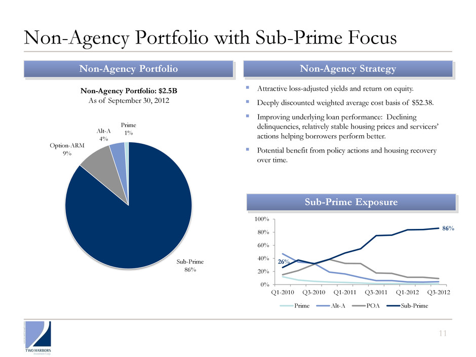 10 Agency Portfolio with Prepayment Protection Agency RMBS Portfolio Agency Strategy Agency Portfolio: $12.8B1 As of September 30, 2012 Other Low Loan Balance Pools4 10% Low FICO6 7% Post 2006 - Discount 1% Prepayment Protected 4% Seasoned7 5% HECM5 15% High LTV (Predominately MHA)2 31% $85K Max Pools3 25% (1) Includes Agency derivatives (“IIOs”) of $329 million as of September 30, 2012. (2) Securities collateralized by loans with greater than or equal to 80% loan-to-value ratio. High LTV pools are predominately Making Homeownership Affordable pools. Making Homeownership Affordable (or “MHA”) pools consist of borrowers who have refinanced through the Home Affordable Refinance Program (HARP). (3) Securities collateralized by loans of less than or equal to $85K. (4) Securities collateralized by loans of less than or equal to $175K, but more than $85K. (5) Home Equity Conversion Mortgage loans (or “HECM”) are loans that allow the homeowner to convert home equity into cash collateralized by the value of their home. (6) Securities collateralized by loans held by lower credit borrowers as defined by Fair Isaac Corporation’s, or FICO, scoring model. (7) Securities collateralized by loans reflecting less prepayment risk due to previously experienced high levels of refinancing. (8) Represents the three month average CPR, or constant prepayment rate, for Agency RMBS securities and Agency derivatives. Post 2006 - Premium & IOs 2% Attractive returns with moderate leverage in 6.0x - 7.0x range. Intense focus on prepayment stability intended to provide for sustainable yields. Stable cash flows make interest rate hedging more effective. Implicit or explicit prepayment protection of 98%. Agency CPR8 5.5% 5.9% 5.6% 6.0% 6.0% 0.0% 5.0% 10.0% 15.0% 20.0% Q3-2011 Q4-2011 Q1-2012 Q2-2012 Q3-2012 Agency RMBS CPRImplicit or Explicit Prepayment Protected Securities (98%) Other (2%)