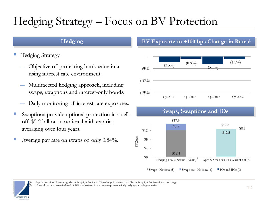 11 Non-Agency Portfolio with Sub-Prime Focus Sub-Prime Exposure Non-Agency Strategy Non-Agency Portfolio Non-Agency Portfolio: $2.5B As of September 30, 2012 Option-ARM 9% Alt-A 4% Prime 1% Sub-Prime 86% Attractive loss-adjusted yields and return on equity. Deeply discounted weighted average cost basis of $52.38. Improving underlying loan performance: Declining delinquencies, relatively stable housing prices and servicers’ actions helping borrowers perform better. Potential benefit from policy actions and housing recovery over time. 26% 86% 0% 20% 40% 60% 80% 100% Q1-2010 Q3-2010 Q1-2011 Q3-2011 Q1-2012 Q3-2012 Prime Alt-A POA Sub-Prime