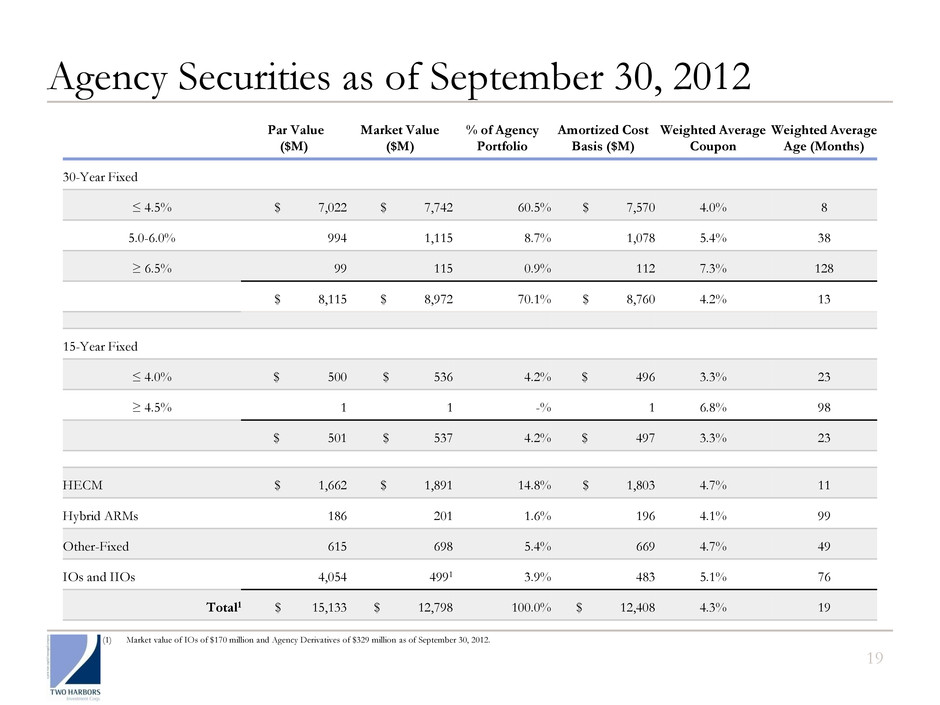 Agency: Vintage & Prepayment Protection Q2-2012 Q3-2012 High LTV (predominately MHA)1 21% 31% $85K Max Pools2 31% 25% HECM3 17% 15% Other Low Loan Balance Pools4 11% 10% Low FICO5 4% 7% Seasoned (2005 and prior vintages) 7% 5% Prepayment protected 6% 4% 2006 & subsequent vintages - Discount -% 1% 2006 & subsequent vintages – Premium and IOs 3% 2% Portfolio Composition as of September 30, 2012 Implicit or Explicit Pre-payment Protection Non-Agency: Loan Type Q2-2012 Q3-2012 Sub-Prime 84% 86% Option-ARM 11% 9% Alt-A 4% 4% Prime 1% 1% (1) Securities collateralized by loans with greater than or equal to 80% loan-to-value. High LTV pools are predominately Making Homeownership Affordable pools. Making Homeownership Affordable (or “MHA”) pools consist of borrowers who have refinanced through the Home Affordable Refinance Program (HARP). (2) Securities collateralized by loans of less than or equal to $85K. (3) Home Equity Conversion Mortgage loans (or “HECM”) are loans that allow the homeowner to convert home equity into cash collateralized by the value of their home. (4) Securities collateralized by loans of less than or equal to $175K, but more than $85K. (5) Securities collateralized by loans held by lower credit borrowers as defined by Fair Isaac Corporation’s, or FICO, scoring model. 18