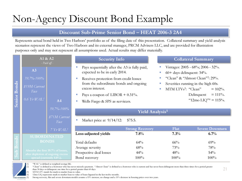 Pays sequentially after the A3 is fully paid, expected to be in early 2014. Receives protection from credit losses from the subordinate bonds and ongoing excess interest. Pays a coupon of LIBOR + 0.31%. Wells Fargo & SPS as servicers. A3 39.7%-100% $19M Current Face 0.6 Yr WAL1 SUBORDINATED BONDS Absorbs the first 39.7% of losses, after depletion of ongoing excess spread (currently 4.0%). Vintages: 2005 - 68%; 2006 - 32%. 60+ days delinquent: 34%. “Clean” & “Almost Clean”2: 29%. Severities running in the high 60s. MTM LTVs3: “Clean” = 102%. Delinquent = 111%. “12mo LIQ”4 = 115%. Market price at 9/14/12: $75.5. Security Info Collateral Summary Yield Analysis5 Strong Recovery Flat Severe Downturn Loss-adjusted yields 7.8% 7.3% 6.7% Total defaults 64% 66% 69% Average severity 68% 73% 78% Prospective deal losses 44% 48% 54% Bond recovery 100% 100% 100% Non-Agency Discount Bond Example 21 A4 39.7%-100% $71M Current Face 7 Yr WAL1 S e n ior B o n d s A1 & A2 - Paid off - S u b Bon d s (1) “WAL” is defined as weighted average life. (2) “Clean” is defined as a borrower who has never missed a payment. “Almost Clean” is defined as a borrower who is current and has never been delinquent more than three times for a period greater than 30 days or delinquent one time for a period greater than 60 days. (3) MTM LTV stands for mark-to-market loan-to-value. (4) 12mo LIQ represents mark-to-market loan-to-value of loans liquated in the last twelve months. (5) Strong recovery, flat and severe downturn models assume a 15% increase, no change and a 15% decrease in housing prices over two years. Represents actual bond held in Two Harbors’ portfolio as of the filing date of this presentation. Collateral summary and yield analysis scenarios represent the views of Two Harbors and its external manager, PRCM Advisers LLC, and are provided for illustration purposes only and may not represent all assumptions used. Actual results may differ materially. Discount Sub-Prime Senior Bond – HEAT 2006-3 2A4