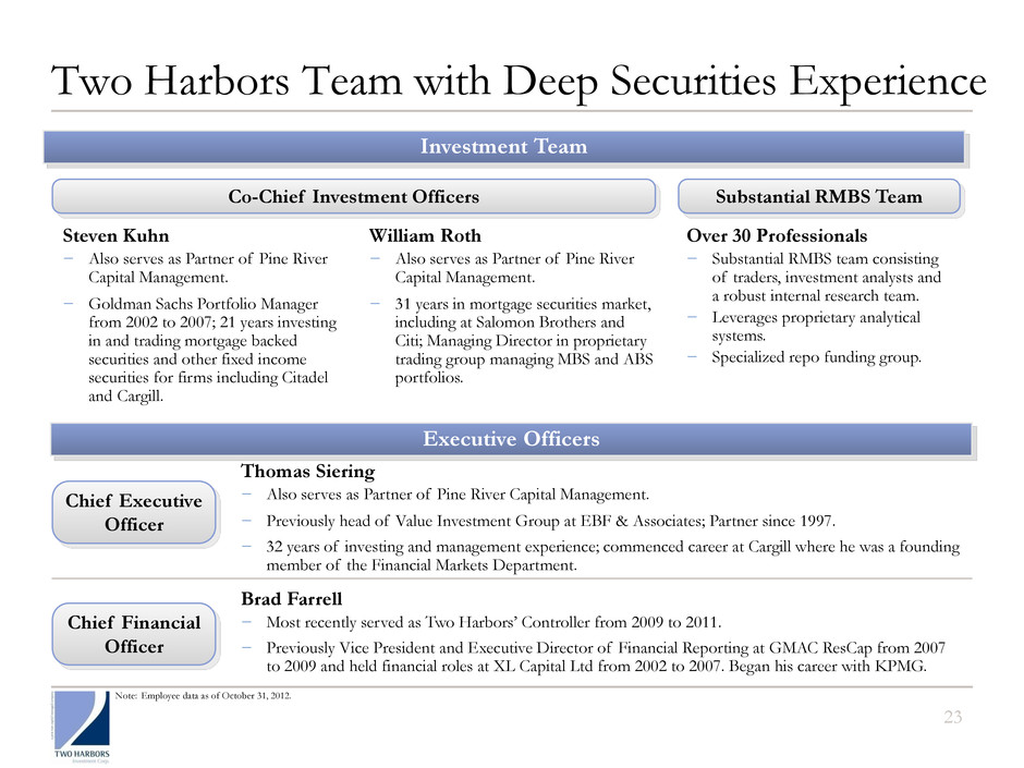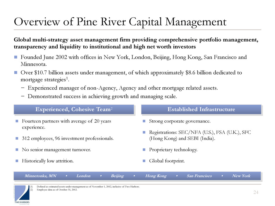 23 William Roth − Also serves as Partner of Pine River Capital Management. − 31 years in mortgage securities market, including at Salomon Brothers and Citi; Managing Director in proprietary trading group managing MBS and ABS portfolios. Brad Farrell − Most recently served as Two Harbors’ Controller from 2009 to 2011. − Previously Vice President and Executive Director of Financial Reporting at GMAC ResCap from 2007 to 2009 and held financial roles at XL Capital Ltd from 2002 to 2007. Began his career with KPMG. Steven Kuhn − Also serves as Partner of Pine River Capital Management. − Goldman Sachs Portfolio Manager from 2002 to 2007; 21 years investing in and trading mortgage backed securities and other fixed income securities for firms including Citadel and Cargill. Thomas Siering − Also serves as Partner of Pine River Capital Management. − Previously head of Value Investment Group at EBF & Associates; Partner since 1997. − 32 years of investing and management experience; commenced career at Cargill where he was a founding member of the Financial Markets Department. Over 30 Professionals − Substantial RMBS team consisting of traders, investment analysts and a robust internal research team. − Leverages proprietary analytical systems. − Specialized repo funding group. Chief Financial Officer Chief Executive Officer Co-Chief Investment Officers Substantial RMBS Team Two Harbors Team with Deep Securities Experience Note: Employee data as of October 31, 2012. Executive Officers Investment Team