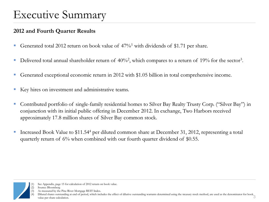2 Forward-Looking Statements This presentation includes “forward-looking statements” within the meaning of the safe harbor provisions of the United States Private Securities Litigation Reform Act of 1995. Actual results may differ from expectations, estimates and projections and, consequently, readers should not rely on these forward-looking statements as predictions of future events. Words such as “expect,” “target,” “assume,” “estimate,” “project,” “budget,” “forecast,” “anticipate,” “intend,” “plan,” “may,” “will,” “could,” “should,” “believe,” “predicts,” “potential,” “continue,” and similar expressions are intended to identify such forward-looking statements. These forward-looking statements involve significant risks and uncertainties that could cause actual results to differ materially from expected results. Factors that could cause actual results to differ include, but are not limited to, higher than expected operating costs, changes in prepayment speeds of mortgages underlying our RMBS, the rates of default or decreased recovery on the mortgages underlying our non-Agency securities, failure to recover certain losses that are expected to be temporary, changes in interest rates or the availability of financing, the impact of new legislation or regulatory changes on our operations, the impact of any deficiencies in the servicing or foreclosure practices of third parties and related delays in the foreclosure process, the inability to acquire mortgage loans or securitize the mortgage loans we acquire, the impact of new or modified government mortgage refinance or principal reduction programs, and unanticipated changes in overall market and economic conditions. Readers are cautioned not to place undue reliance upon any forward-looking statements, which speak only as of the date made. Two Harbors does not undertake or accept any obligation to release publicly any updates or revisions to any forward-looking statement to reflect any change in its expectations or any change in events, conditions or circumstances on which any such statement is based. Additional information concerning these and other risk factors is contained in Two Harbors’ most recent filings with the Securities and Exchange Commission. All subsequent written and oral forward looking statements concerning Two Harbors or matters attributable to Two Harbors or any person acting on its behalf are expressly qualified in their entirety by the cautionary statements above. Safe Harbor Statement
