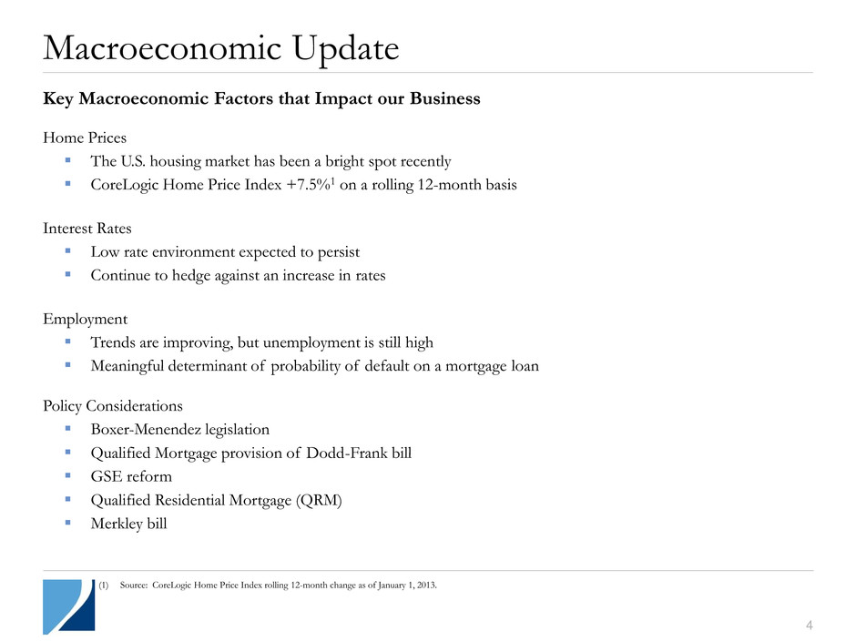 Executive Summary 2012 and Fourth Quarter Results Generated total 2012 return on book value of 47%1 with dividends of $1.71 per share. Delivered total annual shareholder return of 40%2, which compares to a return of 19% for the sector3. Generated exceptional economic return in 2012 with $1.05 billion in total comprehensive income. Key hires on investment and administrative teams. Contributed portfolio of single-family residential homes to Silver Bay Realty Trusty Corp. (“Silver Bay”) in conjunction with its initial public offering in December 2012. In exchange, Two Harbors received approximately 17.8 million shares of Silver Bay common stock. Increased Book Value to $11.544 per diluted common share at December 31, 2012, representing a total quarterly return of 6% when combined with our fourth quarter dividend of $0.55. (1) See Appendix, page 15 for calculation of 2012 return on book value. (2) Source: Bloomberg (3) As measured by the Pine River Mortgage REIT Index. (4) Diluted shares outstanding at end of period, which includes the effect of dilutive outstanding warrants determined using the treasury stock method, are used as the denominator for book value per share calculation. 3