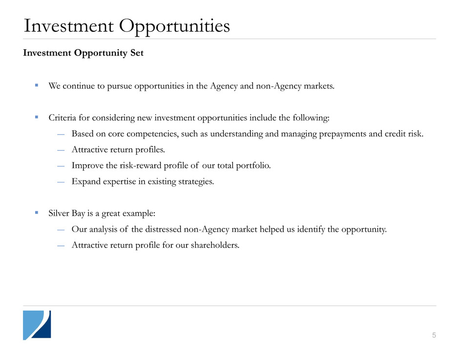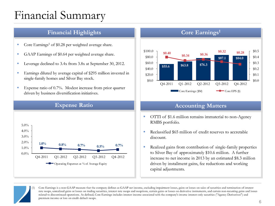 5 Investment Opportunities Investment Opportunity Set We continue to pursue opportunities in the Agency and non-Agency markets. Criteria for considering new investment opportunities include the following: ― Based on core competencies, such as understanding and managing prepayments and credit risk. ― Attractive return profiles. ― Improve the risk-reward profile of our total portfolio. ― Expand expertise in existing strategies. Silver Bay is a great example: ― Our analysis of the distressed non-Agency market helped us identify the opportunity. ― Attractive return profile for our shareholders.