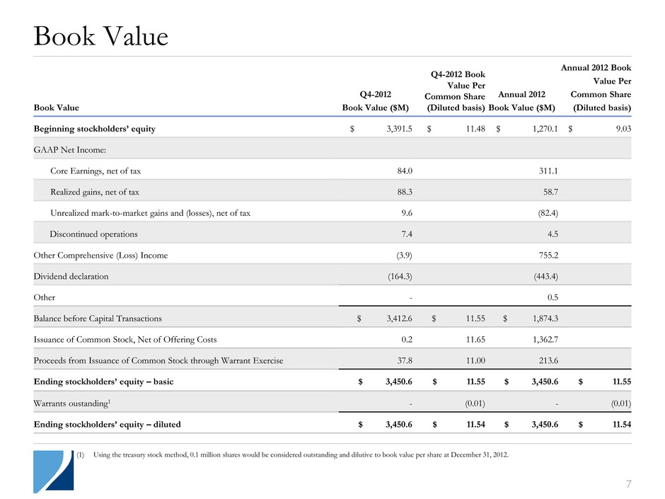 110 110 6 Financial Summary Financial Highlights Core Earnings1 Expense Ratio Core Earnings1 of $0.28 per weighted average share. GAAP Earnings of $0.64 per weighted average share. Leverage declined to 3.4x from 3.8x at September 30, 2012. Earnings diluted by average capital of $295 million invested in single-family homes and Silver Bay stock. Expense ratio of 0.7%. Modest increase from prior quarter driven by business diversification initiatives. $55.6 $63.8 $76.3 $87.1 $84.0 $0.40 $0.34 $0.36 $0.32 $0.28 $0.0 $0.1 $0.2 $0.3 $0.4 $0.5 $0.0 $20.0 $40.0 $60.0 $80.0 $100.0 Q4-2011 Q1-2012 Q2-2012 Q3-2012 Q4-2012 Core Earnings ($M) Core EPS ($) 1.0% 0.8% 0.7% 0.5% 0.7% 0.0% 1.0% 2.0% 3.0% 4.0% 5.0% Q4-2011 Q1-2012 Q2-2012 Q3-2012 Q4-2012 Operating Expenses as % of Average Equity (1) Core Earnings is a non-GAAP measure that the company defines as GAAP net income, excluding impairment losses, gains or losses on sales of securities and termination of interest rate swaps, unrealized gains or losses on trading securities, interest rate swaps and swaptions, certain gains or losses on derivative instruments, and certain non-recurring gains and losses related to discontinued operations. As defined, Core Earnings includes interest income associated with the company's inverse interest-only securities ("Agency Derivatives") and premium income or loss on credit default swaps. Accounting Matters OTTI of $1.6 million remains immaterial to non-Agency RMBS portfolio. Reclassified $65 million of credit reserves to accretable discount. Realized gains from contribution of single-family properties to Silver Bay of approximately $10.6 million. A further increase to net income in 2013 by an estimated $8.3 million driven by installment gains, fee reductions and working capital adjustments.