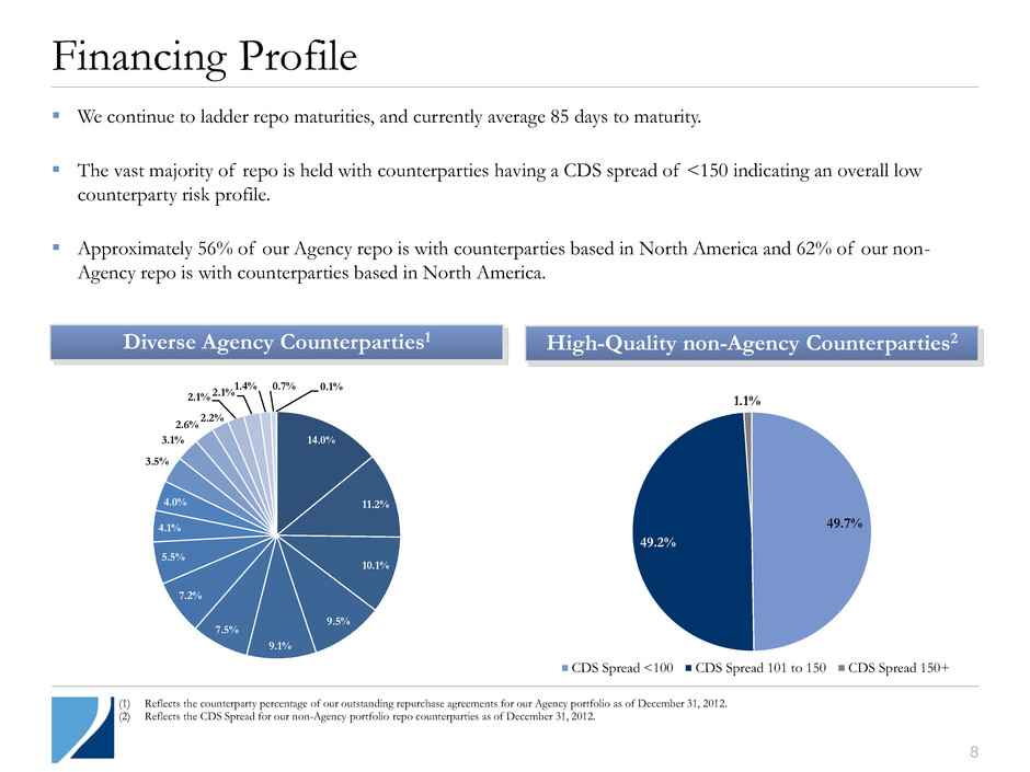 7 Book Value Book Value Q4-2012 Book Value ($M) Q4-2012 Book Value Per Common Share (Diluted basis) Annual 2012 Book Value ($M) Annual 2012 Book Value Per Common Share (Diluted basis) Beginning stockholders’ equity $ 3,391.5 $ 11.48 $ 1,270.1 $ 9.03 GAAP Net Income: Core Earnings, net of tax 84.0 311.1 Realized gains, net of tax 88.3 58.7 Unrealized mark-to-market gains and (losses), net of tax 9.6 (82.4) Discontinued operations 7.4 4.5 Other Comprehensive (Loss) Income (3.9) 755.2 Dividend declaration (164.3) (443.4) Other - 0.5 Balance before Capital Transactions $ 3,412.6 $ 11.55 $ 1,874.3 Issuance of Common Stock, Net of Offering Costs 0.2 11.65 1,362.7 Proceeds from Issuance of Common Stock through Warrant Exercise 37.8 11.00 213.6 Ending stockholders’ equity – basic $ 3,450.6 $ 11.55 $ 3,450.6 $ 11.55 Warrants oustanding1 - (0.01) - (0.01) Ending stockholders’ equity – diluted $ 3,450.6 $ 11.54 $ 3,450.6 $ 11.54 (1) Using the treasury stock method, 0.1 million shares would be considered outstanding and dilutive to book value per share at December 31, 2012.