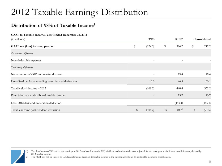 9 2012 Taxable Earnings Distribution GAAP to Taxable Income, Year Ended December 31, 2012 (in millions) TRS REIT Consolidated GAAP net (loss) income, pre-tax $ (124.5) $ 374.2 $ 249.7 Permanent differences Non-deductible expenses - - - Temporary differences Net accretion of OID and market discount - 19.4 19.4 Unrealized net loss on trading securities and derivatives 16.3 46.8 63.1 Taxable (loss) income – 2012 (108.2) 440.4 332.2 Plus: Prior year undistributed taxable income - 13.7 13.7 Less: 2012 dividend declaration deduction - (443.4) (443.4) Taxable income post-dividend deduction $ (108.2) $ 10.72 $ (97.5) (1) The distribution of 98% of taxable earnings in 2012 was based upon the 2012 dividend declaration deduction, adjusted for the prior year undistributed taxable income, divided by 2012 taxable income. (2) The REIT will not be subject to U.S. federal income taxes on its taxable income to the extent it distributes its net taxable income to stockholders. Distribution of 98% of Taxable Income1