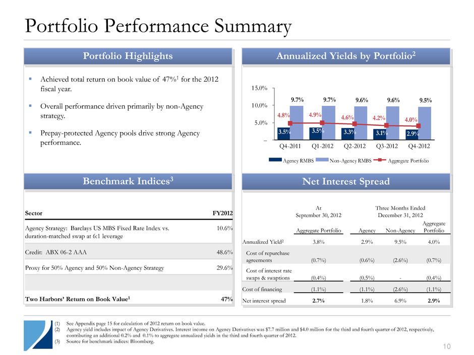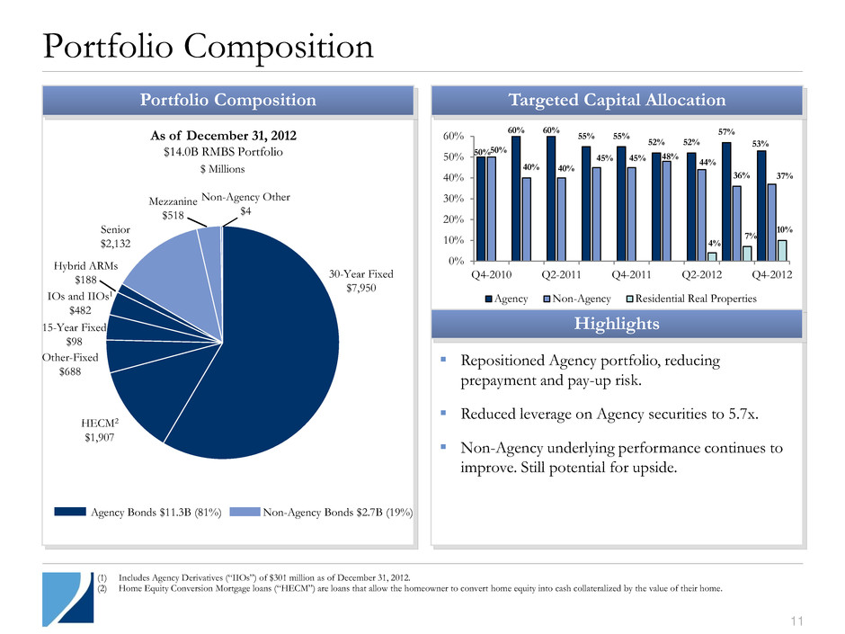 110 Achieved total return on book value of 47%1 for the 2012 fiscal year. Overall performance driven primarily by non-Agency strategy. Prepay-protected Agency pools drive strong Agency performance. Sector FY2012 Agency Strategy: Barclays US MBS Fixed Rate Index vs. duration-matched swap at 6:1 leverage 10.6% Credit: ABX 06-2 AAA 48.6% Proxy for 50% Agency and 50% Non-Agency Strategy 29.6% Two Harbors’ Return on Book Value1 47% Benchmark Indices3 Portfolio Performance Summary 10 110 3.5% 3.5% 3.3% 3.1% 2.9% 9.7% 9.7% 9.6% 9.6% 9.5% 4.8% 4.9% 4.6% 4.2% 4.0% – 5.0% 10.0% 15.0% Q4-2011 Q1-2012 Q2-2012 Q3-2012 Q4-2012 Agency RMBS Non-Agency RMBS Aggregate Portfolio (1) See Appendix page 15 for calculation of 2012 return on book value. (2) Agency yield includes impact of Agency Derivatives. Interest income on Agency Derivatives was $7.7 million and $4.0 million for the third and fourth quarter of 2012, respectively, contributing an additional 0.2% and 0.1% to aggregate annualized yields in the third and fourth quarter of 2012. (3) Source for benchmark indices: Bloomberg. At September 30, 2012 Three Months Ended December 31, 2012 Aggregate Portfolio Agency Non-Agency Aggregate Portfolio Annualized Yield2 3.8% 2.9% 9.5% 4.0% Cost of repurchase agreements (0.7%) (0.6%) (2.6%) (0.7%) Cost of interest rate swaps & swaptions (0.4%) (0.5%) - (0.4%) Cost of financing (1.1%) (1.1%) (2.6%) (1.1%) Net interest spread 2.7% 1.8% 6.9% 2.9% Portfolio Highlights Annualized Yields by Portfolio2 Net Interest Spread