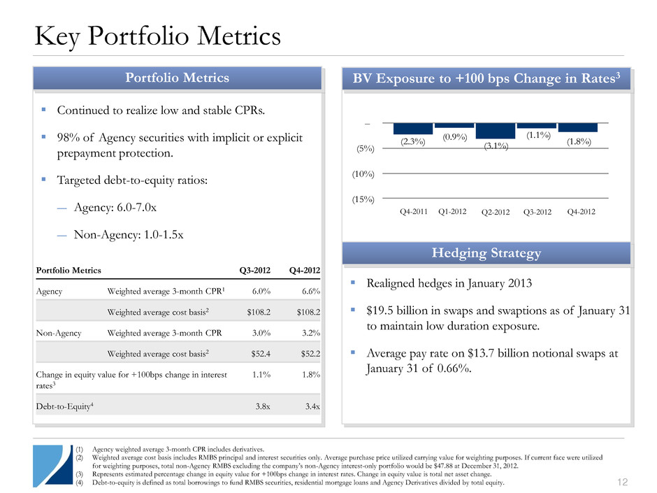 110 110 Portfolio Composition 11 (1) Includes Agency Derivatives (“IIOs”) of $301 million as of December 31, 2012. (2) Home Equity Conversion Mortgage loans (“HECM”) are loans that allow the homeowner to convert home equity into cash collateralized by the value of their home. Highlights Targeted Capital Allocation Repositioned Agency portfolio, reducing prepayment and pay-up risk. Reduced leverage on Agency securities to 5.7x. Non-Agency underlying performance continues to improve. Still potential for upside. As of December 31, 2012 $14.0B RMBS Portfolio $ Millions Agency Bonds $11.3B (81%) Non-Agency Bonds $2.7B (19%) 30-Year Fixed $7,950 15-Year Fixed $98 HECM2 $1,907 Other-Fixed $688 IOs and IIOs1 $482 Hybrid ARMs $188 Mezzanine $518 Senior $2,132 Non-Agency Other $4 Portfolio Composition 50% 60% 60% 55% 55% 52% 52% 57% 53% 50% 40% 40% 45% 45% 48% 44% 36% 37% 4% 7% 10% 0% 10% 20% 30% 40% 50% 60% Q4-2010 Q2-2011 Q4-2011 Q2-2012 Q4-2012 Agency Non-Agency Residential Real Properties