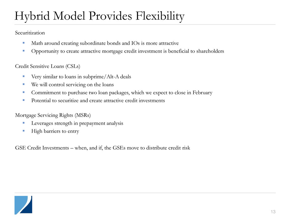 12 110 Key Portfolio Metrics 110 Continued to realize low and stable CPRs. 98% of Agency securities with implicit or explicit prepayment protection. Targeted debt-to-equity ratios: ― Agency: 6.0-7.0x ― Non-Agency: 1.0-1.5x (1) Agency weighted average 3-month CPR includes derivatives. (2) Weighted average cost basis includes RMBS principal and interest securities only. Average purchase price utilized carrying value for weighting purposes. If current face were utilized for weighting purposes, total non-Agency RMBS excluding the company’s non-Agency interest-only portfolio would be $47.88 at December 31, 2012. (3) Represents estimated percentage change in equity value for +100bps change in interest rates. Change in equity value is total net asset change. (4) Debt-to-equity is defined as total borrowings to fund RMBS securities, residential mortgage loans and Agency Derivatives divided by total equity. Realigned hedges in January 2013 $19.5 billion in swaps and swaptions as of January 31 to maintain low duration exposure. Average pay rate on $13.7 billion notional swaps at January 31 of 0.66%. Portfolio Metrics Q3-2012 Q4-2012 Agency Weighted average 3-month CPR1 6.0% 6.6% Weighted average cost basis2 $108.2 $108.2 Non-Agency Weighted average 3-month CPR 3.0% 3.2% Weighted average cost basis2 $52.4 $52.2 Change in equity value for +100bps change in interest rates3 1.1% 1.8% Debt-to-Equity4 3.8x 3.4x Portfolio Metrics BV Exposure to +100 bps Change in Rates3 (2.3%) (0.9%) (3.1%) (1.1%) (1.8%) (15%) (10%) (5%) – Q3-2012 Hedging Strategy Q2-2012 Q1-2012 Q4-2011 Q4-2012