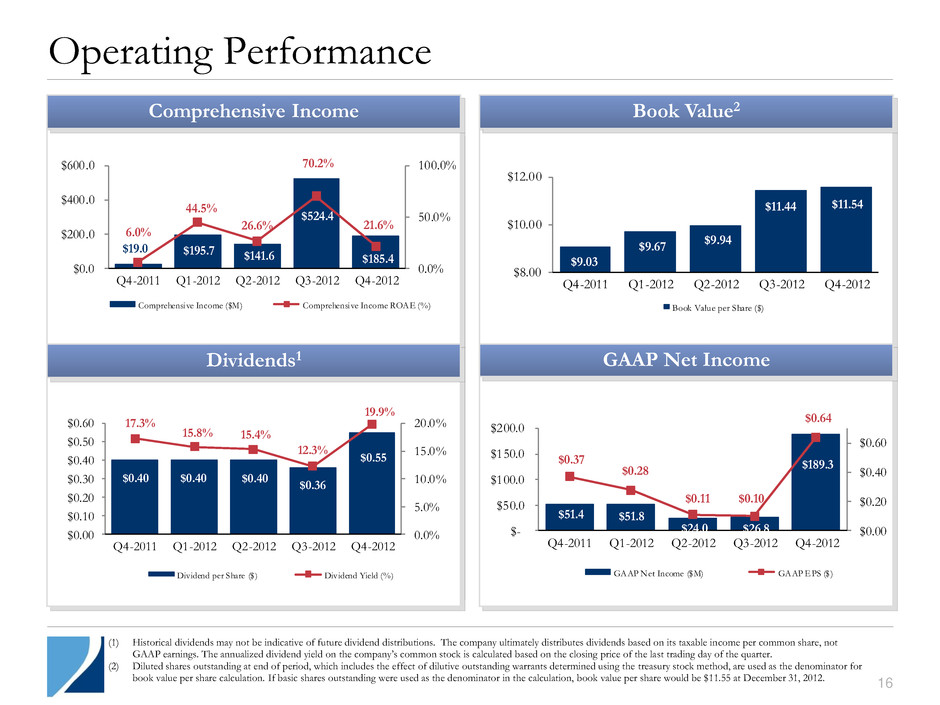 15 2012 Return on Book Value of 47% Return on book value1 (Per diluted share amounts, except for percentage) Book value at December 31, 2012 $ 11.54 Book value at December 31, 2011 9.03 Increase in book value 2.51 Dividends declared in 2012 1.71 Return on book value ($) $ 4.22 Return on book value (%) 47% (1) Diluted shares outstanding at end of period, which includes the effect of dilutive outstanding warrants determined using the treasury stock method, are used as the denominator for book value per share calculation.