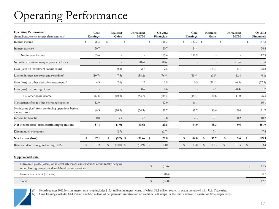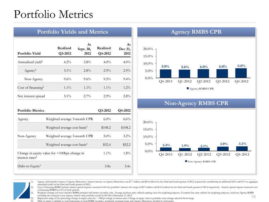 17 Operating Performance (1) Fourth quarter 2012 loss on interest rate swap includes $15.4 million in interest costs, of which $1.1 million relates to swaps associated with U.S. Treasuries. (2) Core Earnings includes $3.4 million and $3.8 million of net premium amortization on credit default swaps for the third and fourth quarter of 2012, respectively. Operating Performance (In millions, except for per share amounts) Core Earnings Realized Gains Unrealized MTM Q3-2012 Financials Core Earnings Realized Gains Unrealized MTM Q4-2012 Financials Interest income $ 126.3 $ - $ - $ 126.3 $ 137.3 $ - $ - $ 137.3 Interest expense 20.7 - - 20.7 24.4 - - 24.4 Net interest income 105.6 - - 105.6 112.9 - - 112.9 Net other-than-temporary impairment losses - - (0.6) (0.6) - - (1.6) (1.6) Gain (loss) on investment securities, net - (0.2) 2.7 2.5 - 103.1 5.1 108.2 Loss on interest rate swap and swaptions1 (10.7) (7.5) (58.2) (76.4) (15.4) (3.5) 12.8 (6.1) Gain (loss) on other derivative instruments2 4.3 (2.6) 1.2 2.9 0.3 (21.1) (6.5) (27.3) Gain (loss) on mortgage loans - - 0.6 0.6 - 2.1 (0.4) 1.7 Total other (loss) income (6.4) (10.3) (53.7) (70.4) (15.1) 80.6 11.0 76.5 Management fees & other operating expenses 12.9 - - 12.9 16.1 - - 16.1 Net income (loss) from continuing operations before income taxes 86.3 (10.3) (54.3) 21.7 81.7 80.6 9.4 171.7 Income tax benefit 0.8 3.3 3.7 7.8 2.3 7.7 0.2 10.2 Net income (loss) from continuing operations 87.1 (7.0) (50.6) 29.5 84.0 88.3 9.6 181.9 Discontinued operations - (2.7) - (2.7) - 7.4 - 7.4 Net income (loss) $ 87.1 $ (9.7) $ (50.6) $ 26.8 $ 84.0 $ 95.7 $ 9.6 $ 189.3 Basic and diluted weighted average EPS $ 0.32 $ (0.03) $ (0.19) $ 0.10 $ 0.28 $ 0.33 $ 0.03 $ 0.64 Supplemental data: Unrealized gains/(losses) on interest rate swaps and swaptions economically hedging repurchase agreements and available-for-sale securities $ (53.6) $ 11.9 Income tax benefit (expense) (0.4) 0.3 Total $ (54.0) $ 12.2