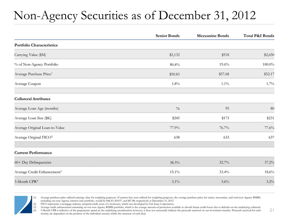 20 Agency Securities as of December 31, 2012 Par Value ($M) Market Value ($M) % of Agency Portfolio Amortized Cost Basis ($M) Weighted Average Coupon Weighted Average Age (Months) 30-Year Fixed 3.0-3.5% $ 2,747 $ 2,919 25.8% $ 2,910 3.2% 4 4.0-4.5% 3,502 3,868 34.1% 3,801 4.2% 10 ≥ 5.0% 1,040 1,163 10.2% 1,132 5.6% 49 $ 7,289 $ 7,950 70.1% $ 7,843 4.0% 14 15-Year Fixed 3.0-3.5% $ 85 $ 90 0.8% $ 83 3.0% 25 4.0-4.5% 2 3 0.1% 2 4.0% 30 ≥ 5.0% 5 5 0.1% 5 5.8% 109 $ 92 $ 98 1.0% $ 90 3.2% 29 HECM $ 1,670 $ 1,907 16.8% $ 1,804 4.7% 14 Hybrid ARMs 174 188 1.7% 183 4.0% 103 Other-Fixed 604 688 6.1% 655 4.7% 51 IOs and IIOs 4,015 4821 4.3% 466 5.0% 74 Total1 $ 13,844 $ 11,313 100.0% $ 11,041 4.2% 20 (1) Market value of IOs of $181 million and Agency Derivatives of $301 million as of December 31, 2012.