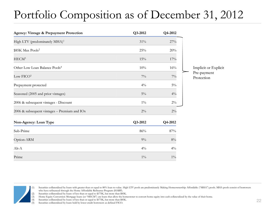 21 Non-Agency Securities as of December 31, 2012 Senior Bonds Mezzanine Bonds Total P&I Bonds Portfolio Characteristics Carrying Value ($M) $2,132 $518 $2,650 % of Non-Agency Portfolio 80.4% 19.6% 100.0% Average Purchase Price1 $50.83 $57.68 $52.17 Average Coupon 1.8% 1.1% 1.7% Collateral Attributes Average Loan Age (months) 76 95 80 Average Loan Size ($K) $245 $173 $231 Average Original Loan-to-Value 77.9% 76.7% 77.6% Average Original FICO2 638 633 637 Current Performance 60+ Day Delinquencies 38.3% 32.7% 37.2% Average Credit Enhancement3 15.1% 33.4% 18.6% 3-Month CPR4 3.1% 3.6% 3.2% (1) Average purchase price utilized carrying value for weighting purposes. If current face were utilized for weighting purposes, the average purchase price for senior, mezzanine, and total non-Agency RMBS, excluding our non-Agency interest-only portfolio, would be $46.43, $54.97, and $47.88, respectively at December 31, 2012. (2) FICO represents a mortgage industry accepted credit score of a borrower, which was developed by Fair Isaac Corporation. (3) Average credit enhancement remaining on our non-Agency RMBS portfolio, which is the average amount of protection available to absorb future credit losses due to defaults on the underlying collateral. (4) 3-Month CPR is reflective of the prepayment speed on the underlying securitization; however, it does not necessarily indicate the proceeds received on our investment tranche. Proceeds received for each security are dependent on the position of the individual security within the structure of each deal.