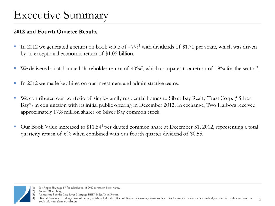 Safe Harbor Statement Forward-Looking Statements This presentation includes “forward-looking statements” within the meaning of the safe harbor provisions of the United States Private Securities Litigation Reform Act of 1995. Actual results may differ from expectations, estimates and projections and, consequently, readers should not rely on these forward-looking statements as predictions of future events. Words such as “expect,” “target,” “assume,” “estimate,” “project,” “budget,” “forecast,” “anticipate,” “intend,” “plan,” “may,” “will,” “could,” “should,” “believe,” “predicts,” “potential,” “continue,” and similar expressions are intended to identify such forward-looking statements. These forward-looking statements involve significant risks and uncertainties that could cause actual results to differ materially from expected results. Factors that could cause actual results to differ include, but are not limited to, higher than expected operating costs, changes in prepayment speeds of mortgages underlying our RMBS, the rates of default or decreased recovery on the mortgages underlying our non-Agency securities, failure to recover certain losses that are expected to be temporary, changes in interest rates or the availability of financing, the impact of new legislation or regulatory changes on our operations, the impact of any deficiencies in the servicing or foreclosure practices of third parties and related delays in the foreclosure process, the inability to acquire mortgage loans or securitize the mortgage loans we acquire, the impact of new or modified government mortgage refinance or principal reduction programs, and unanticipated changes in overall market and economic conditions. Readers are cautioned not to place undue reliance upon any forward-looking statements, which speak only as of the date made. Two Harbors does not undertake or accept any obligation to release publicly any updates or revisions to any forward-looking statement to reflect any change in its expectations or any change in events, conditions or circumstances on which any such statement is based. Additional information concerning these and other risk factors is contained in Two Harbors’ most recent filings with the Securities and Exchange Commission. All subsequent written and oral forward looking statements concerning Two Harbors or matters attributable to Two Harbors or any person acting on its behalf are expressly qualified in their entirety by the cautionary statements above. 1